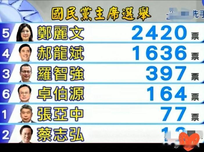 国民党主席选举开票现场太刺激了! 郑丽文2420票一路绝尘,郝龙斌1636票根本追不上,最让人跌破眼镜的是张亚中仅75票排倒数第二,这结果简直是给国民党敲了记重锤。 别觉得意外,郑丽文能赢,本质是98.3%党员喊着要改革的声音起了作用,她的“战斗型”姿态戳中了大家对国民党屡战屡败的不满,比起郝龙斌那套老派中间路线,年轻人和基层更吃“破局”这一套。 而张亚中的惨败才不是能力问题,是他直白的统一主张,撕开了党内“模糊两岸立场”的遮羞布,动了既得利益者的蛋糕。说白了,这次选举选的不是资历,是“敢不敢改”。 郑丽文的领先就是改革派的胜利,至于能不能真的带国民党翻身,就看她能不能扛住派系压力,别让党员的期待落空!