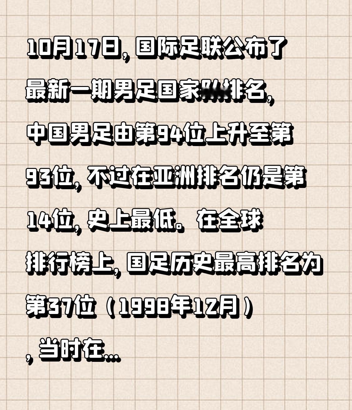 10月17日,国际足联公布了最新一期男足国家队排名,中国男足由第94位上升至第93位,不过在亚洲排名仍是第14位,史上最低。在全球排行榜上,国足历史最高排名为第37位(1998年12月),当时在亚洲排名第四,也是史上最高。20多年过去了,国足在亚洲排名越来越低。不禁让人发问,国足何时才能再次冲击高位呢! 国足亚洲排名 中国足球排名
