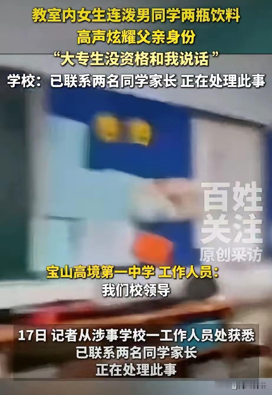 谁能抵挡的住这句话,“像你这样的中专、大专生有资格和我说话吗?”“你知道我爸爸是做什么的吗?” 上海两名高中生在教室吵架,结果女孩一句话把半全网的人都得罪了。 10月14日,上海的某高中教室里面,不知道男同学和女同学之间不知道发生了什么事情,女生立马对男同学说:“像你这样的中专、大专生有资格和我说话吗?”“你知道我爸爸是做什么的吗?”然后还不乐意,拿着自己桌子上的两瓶饮料连泼了两回。 而男同学马上忍不住: 大叫一声,起来就卡住女生的脖子往地上去,把旁边的其他同学都看傻了,马上上前拉人,可怎么拉都拉不住。 而现在不知道是那个老师看不下去了把视频传了出来,还是不知道那个同学把手机带去了教室拍了下来然后传到了网上,现在视频一直在网络疯传,就因为这样的一句话。 而现在该高中学校终于出来解释了,10月18号,上海市高境第一中学官微上面发了一篇文章。 而其中的主要内容是,学校承认这件事情是真的,现在已经在调查了,对涉事的学生进行心理疏导和纪律处理,强调将加强学生思想品德教育和矛盾化解机制,呼吁公众们不传谣、不信谣。 可这是重点吗?女生说的那句话,是不是得解释一下才好,比如他老爸是谁? 还没成功就学会傲慢,父母是怎么教的,惯的吗? 中专大专怎么了?未来逆袭的多了去了! 谁受得了这种人格的侮辱?