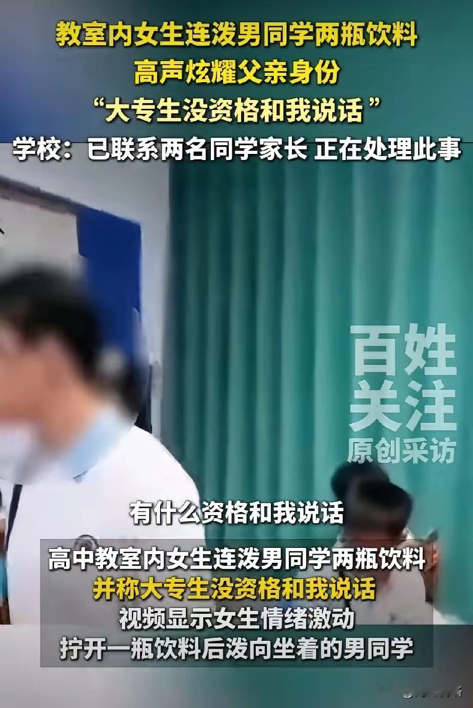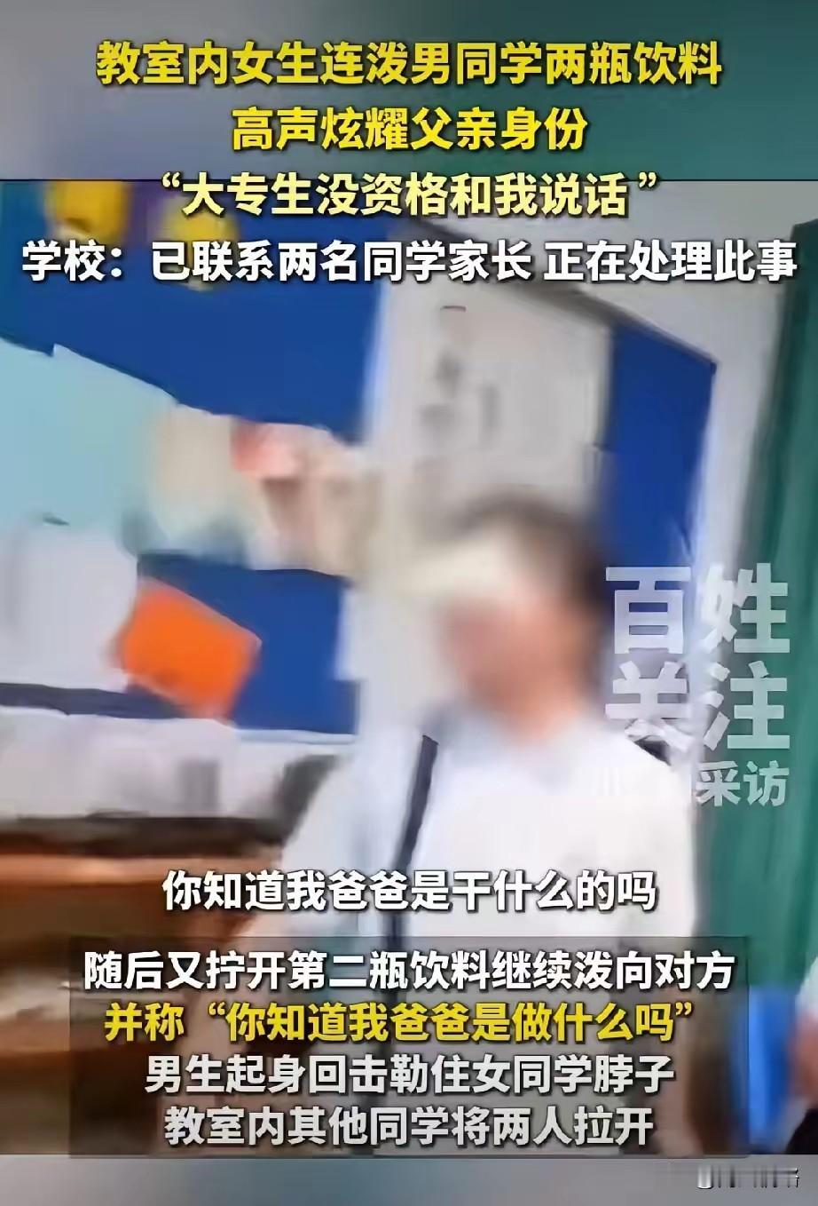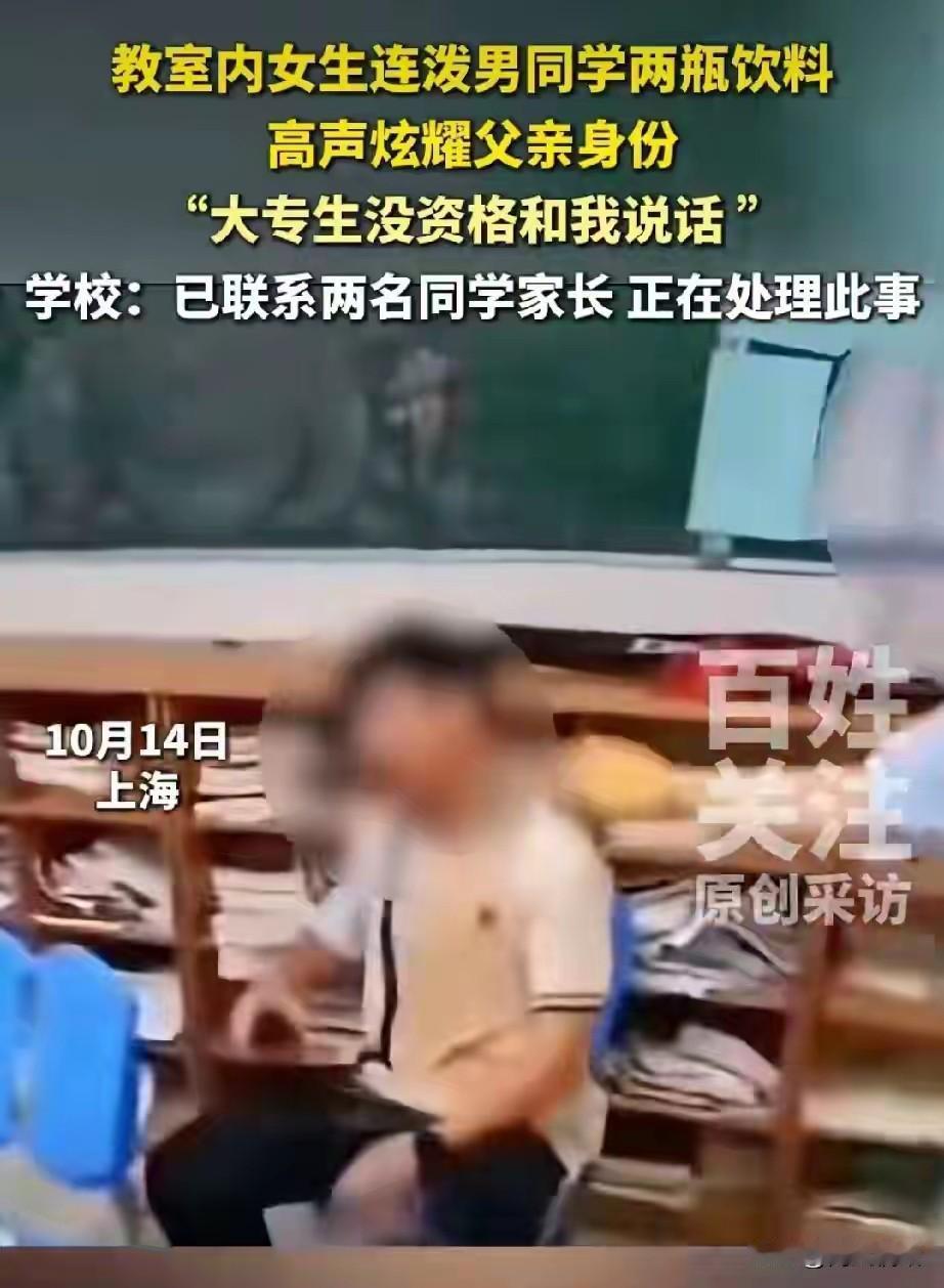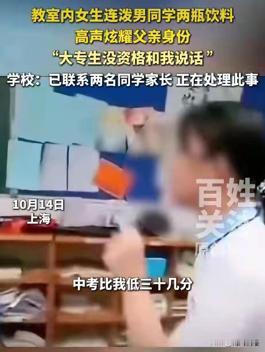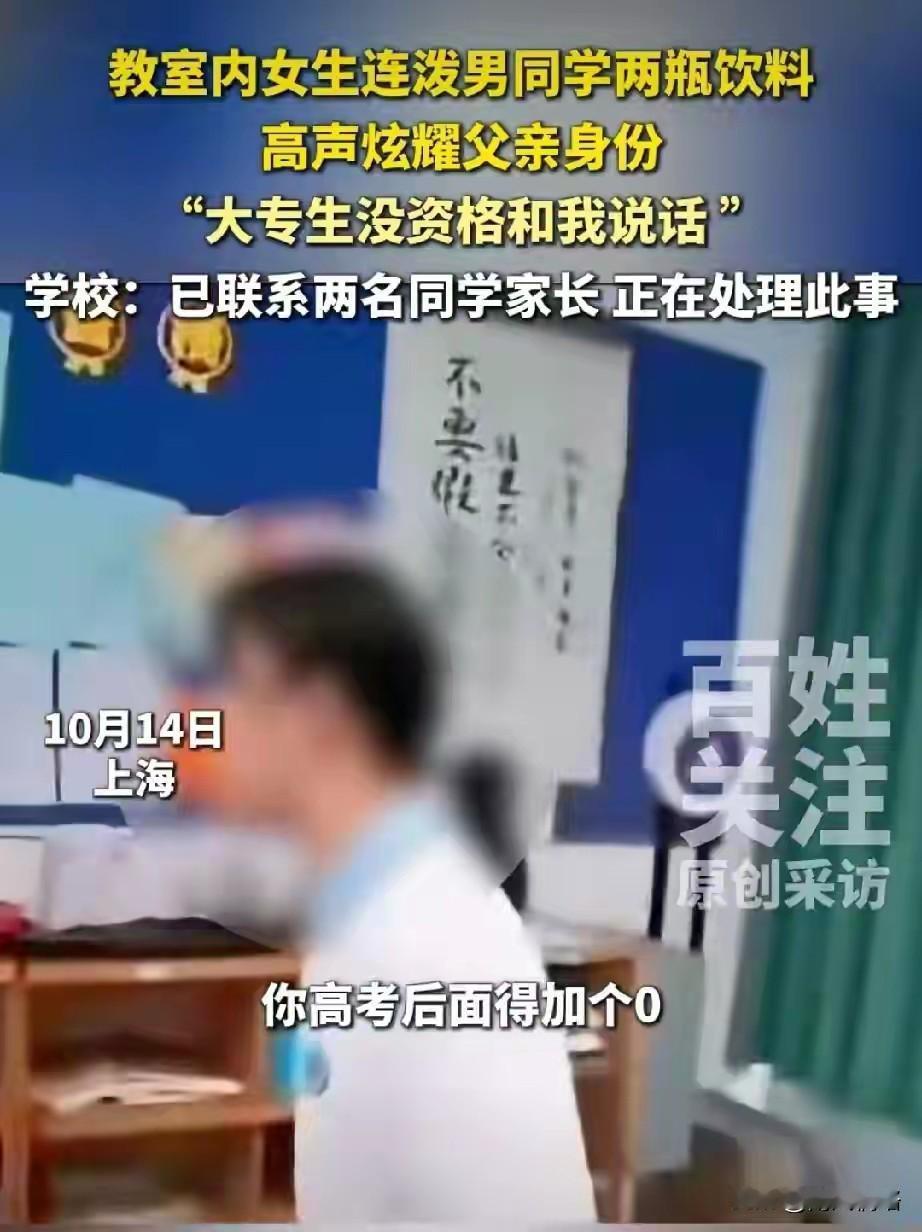 像你这样只能上中专和大专的人有什么资格和我说话,你知道我爸爸是做什么的吗? 上海两名高中生在教室吵架,结果女孩一句话把半全网的人都得罪了。 10月14日,上海的某高中教室里面,不知道男同学和女同学之间不知道发生了什么事情,女生立马对男同学说:“像你这样只能上中专和大专生的人有资格和我说话吗?你知道我爸爸是做什么的吗?”接着拿着桌子上的两瓶饮料泼在了男生身上。 而男同学马上忍不住,起来就用手住女生的脸上打去,等旁边的其他同学回过神来,马上上前拉人,把两个人分开。 而现场画面也被其他的同学录了下来并上传到了网上,就因为这样的一句话。 10月18号,上海市高境第一中学的官微上发了一篇文章。 而其中的主要内容是,学校承认这件事情,现在已经在调查,对涉事的学生进行心理疏导和纪律处理,强调将加强学生思想品德教育和矛盾化解机制,呼吁公众们不传谣、不信谣。 这是重点吗?女生说的那句话,是不是得解释一下才好,比如他爸爸是谁? 还没有成功就已经学会了傲慢,父母惯出来的吗? 中专大专怎么了?未来逆袭的大有在。 谁受得了这种人格的侮辱?