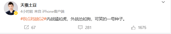 虎扑10月18日讯BLG不敌G2后,知名作家天蚕土豆发文: