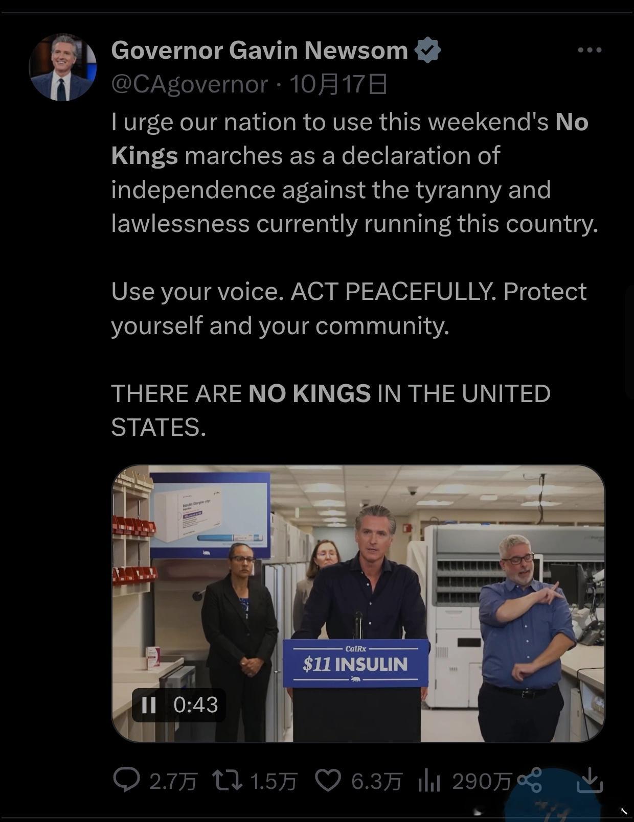 哈里斯、桑德斯和纽森纷纷发文,哈里斯表示“权力在人民的手中”,桑德斯表示“将参加集会,并在华盛顿发表演讲”,纽森表示“应反抗目前统治这个国家的暴政”。