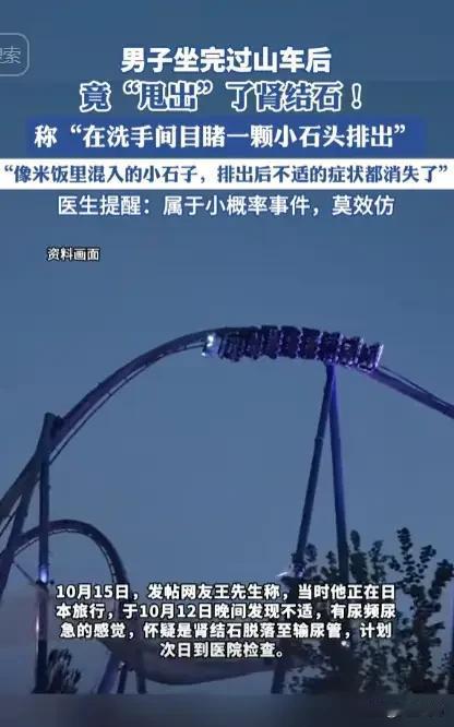 “活久见!”这句话在网络上瞬间炸开了锅。10月13日,一段令人震惊的视频在社交平台火速传播:一名男子在游玩过山车时,突然感觉下半身一阵尿意,慌忙跑向厕所,却意外发现自己排出了一块“黑色石头”。这块“石头”竟然就是困扰他多年的肾结石!网友们纷纷惊呼:原来坐过山车还能“自愈”肾结石?这到底是巧合,还是科学未曾揭示的神奇奇迹? 这件事的背后,隐藏着一个让人深思的秘密:我们对“健康”与“奇迹”的认知,是否还停留在迷信和盲信的边缘?难道,日常生活中那些我们忽视的细节,真的可能藏有意想不到的“奇效”?有人说,这是“巧合”,有人则坚信:或许,人体的潜能远比我们想象的要强大得多。 更值得玩味的是,这个事件让我们重新审视了“身体的自我修复能力”。科学告诉我们,肾结石的形成是多种因素叠加的结果,难以一夜之间“自愈”。但这位男子的经历,似乎在挑战这一认知:或许,身体在某些特殊状态下,能激发出意想不到的自我修复机制。难道我们平时忽略的“放松”和“压力释放”,才是身体康复的关键? 当然,也有人质疑:这是不是巧合?或者,这块“黑色石头”根本不是肾结石,而是其他物质?无论真相如何,这个故事都引发了人们对“健康奇迹”的无限遐想。我们都渴望拥有那种“神奇”的奇迹,渴望在日常生活中找到“自愈”的钥匙。 然而,故事的核心其实在于:我们对健康的认知,是否过于局限?我们是否应该多一些对身体的尊重和信任?或许,科学不能解释一切,但我们可以从中汲取启示:保持乐观、放松心情,也许比任何药物都更有效。 这件事告诉我们一个道理:生活中充满了未知和奇迹,只要我们保持一颗好奇心和一份信任,也许奇迹就会在不经意间发生。你相信“过山车能治病”吗?还是觉得这只是个巧合?无论答案如何,这个故事都值得我们深思:在这个快节奏、压力山大的时代,或许我们更需要学会放松,学会相信生命的奇迹。毕竟,健康的秘密,或许就藏在我们最意想不到的地方。活久见 活久见名场面