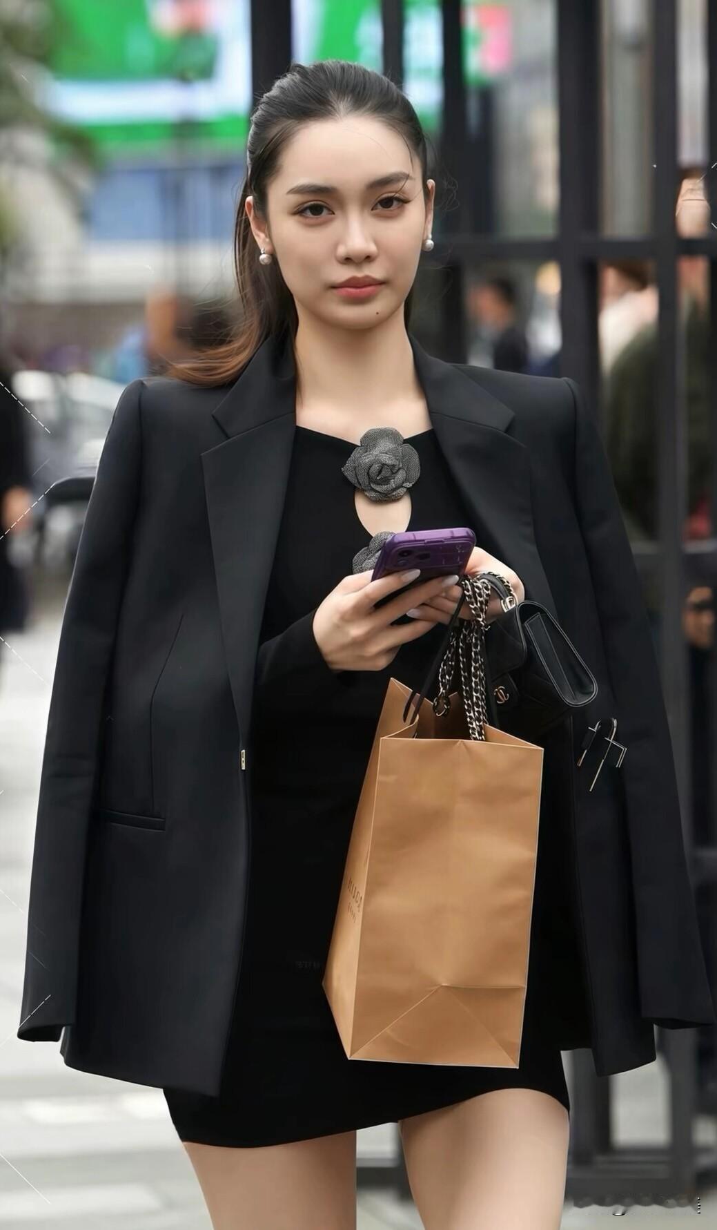 街头偶遇穿搭超有范儿的小姐姐,一身黑西装搭配短裙,脚踩银色高跟鞋,简约又时髦,这穿搭日常出街真亮眼~