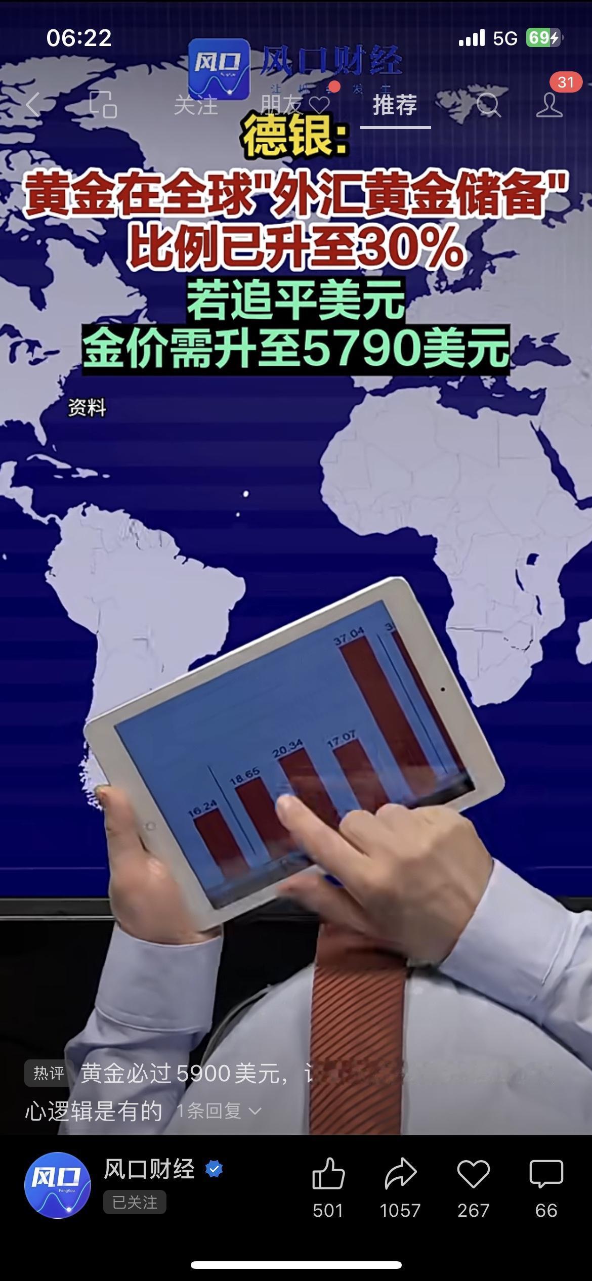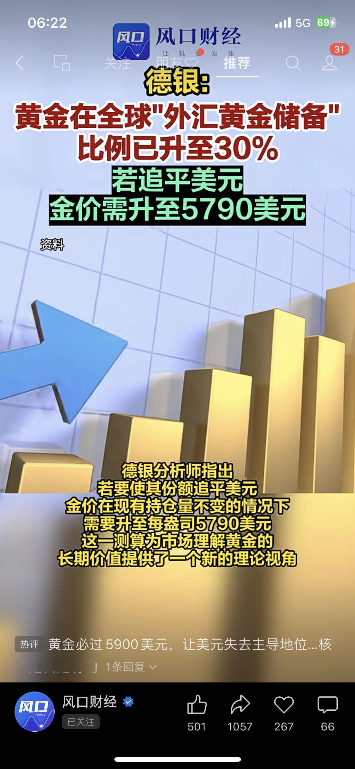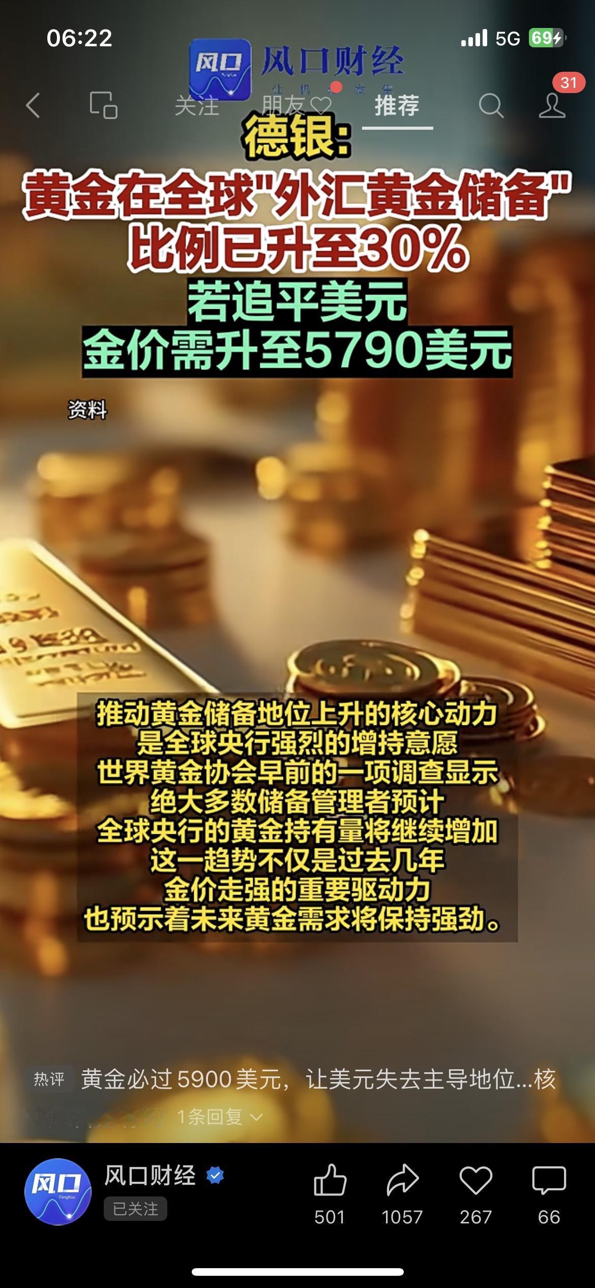 【炸了!德银喊出黄金目标价5790美元,全球央行疯买背后有何玄机?】 家人们快来看!黄金又整了个大新闻!德银最新研究说,现在全球“外汇+黄金”储备里,黄金占比都飙到30%了,反观美元份额从43%掉到40%! 更猛的是,德银分析师直接给了个炸裂预测:要是黄金储备份额追平美元,金价得涨到5790美元/盎司!这可比现在的4200多美元还得涨不少呢! 为啥黄金这么牛?还不是全球央行在疯狂买买买!世界黄金协会调查显示,绝大多数储备管理者都觉得央行会继续狂囤黄金。这种趋势不光是过去几年金价大涨的动力,未来黄金需求也铁定强劲得很! 现在就问大家,这黄金的疯涨势头,你觉得能冲到德银说的5790美元不?评论区聊聊你的看法!
