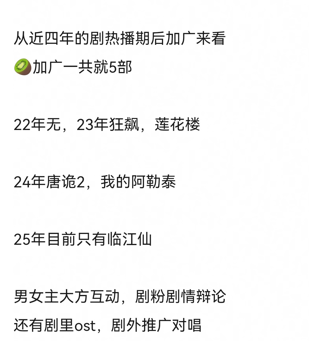 我前几个月追的临江仙加广了!白鹿还是太权威了。这是今年爱奇艺唯一一个热播期后加广