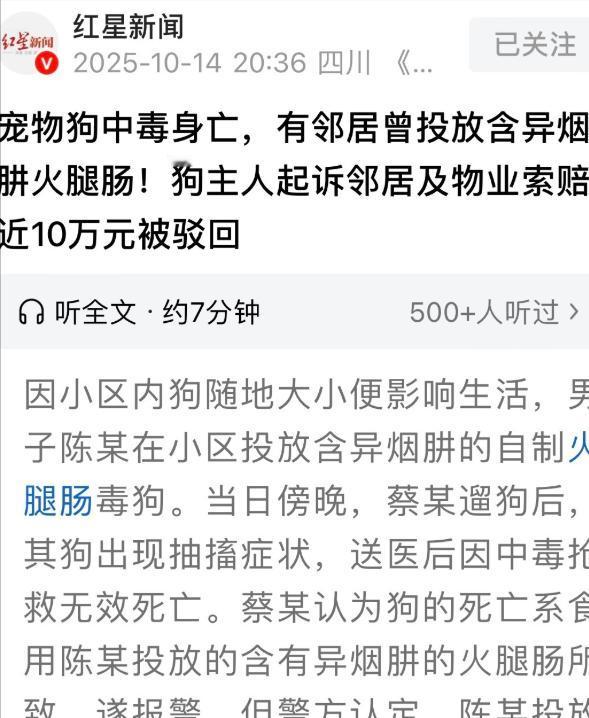 江苏南京,男子嫌小区里的狗总是随地乱尿,他难忍异味,就把带有含异烟肼的火腿肠投放在了小区里,没想到,一泰迪犬当晚中招,食用火腿肠后中毒死亡了,狗主痛失爱犬后悲伤不已,直接把投毒男子和物业告上法庭,索赔狗狗治疗费、火化费,以及精神损失费近10万,然而,法院判决让狗主傻眼。 一个让人大跌眼镜的判决,把江苏南京高淳区这起宠物中毒案推上了风口浪尖。法院对蔡先生近10万元的索赔诉求予以驳回,其全部索赔请求均未获支持。这一裁决为该索赔事宜画上句点,也反映出法律对案件事实的严谨考量。 这案子表面看简单得不能再简单:一边是长期受狗屎尿骚扰、忍无可忍的业主陈某,另一边是痛失爱犬、悲愤交加的狗主人蔡先生。 最关键的是,监控明明拍到了陈某投毒的全过程,证据确凿。那官司怎么还能输得这么彻底?这背后隐匿的故事,其复杂程度远超我们的想象。那些不为人知的情节与纠葛,层层交织,绝非表面那般简单,蕴含着难以言说的奥秘。 法庭上的较量,就像是在显微镜下看东西,任何一个微小的瑕疵都会被无限放大。蔡先生一方的证据,起初看起来无懈可击。 监控视频是个铁证,画面里,陈某往小区90栋和92栋附近的草坪里撒东西的身影一清二楚。而事发当晚,蔡先生的泰迪犬恰好就在那片草丛活动过。 你看,投毒的人,受害的狗,时间和地点,似乎都对上了。这官司,看起来稳赢。 但致命的裂痕,就出现在一个不经意的细节里。原来,那天蔡先生不只带狗去了那一处草坪,他们还溜达到了小区的湖边跑道等多处草丛地带。 这就麻烦了。法律讲的是一个死理儿,“谁主张,谁举证”。蔡先生必须拿出100%的证据,证明他的狗吃下的,不多不少,就是陈某扔的那几根毒火腿肠。 现在冒出了“其他可能性”,那证据链就断了。法官无法排除,狗是在别的地方吃错了东西。 所以,法院的判决并非包庇投毒,而是在提醒所有人:法庭上,再多的眼泪和愤怒,也得建立在一条天衣无缝的证据链上。 说实话,投毒者陈某的愤怒不是没来由的。谁家小院门口和连廊天天一股尿骚味,夏天连窗户都不敢开,都得抓狂。 他也试过和平解决,找过物业,在业主微信群里也喊过话,可收效甚微。矛盾一步步升级,直到去年2月,他直接在楼栋贴了告示,白纸黑字写明要投含异烟肼的毒饵,警告遛狗的人后果自负。 然而,从发警告到亲手把药粉塞进6根火腿肠里,他的维权方式已经严重越界,变成了一种威胁公共安全的行为。这是用一种非法暴力,去对抗另一种不文明。 再将目光投向狗主人蔡先生。他堪称一位文明养犬的典范,于遛狗之际,始终恪守规范,将牵引绳牢牢系于爱犬身上,举止规规矩矩。 可问题恰恰出在一个疏忽上:他没给陪伴自己十多年的“毛孩子”戴上嘴套。 就在那个关键的瞬间,泰迪犬曾短暂挣脱绳子,一头扎进灌木丛里又闻又舔。这个小小的安全盲区,最终为悲剧的发生打开了方便之门。 一个是用极端手段主动攻击,另一个是日常习惯中的被动疏忽。两个人的过失,共同“导演”了这场无法挽回的悲剧。 其实,这起投毒事件在引爆前,早就冒烟了。它暴露出的,是整个社区矛盾管理机制的失灵。 陈某的投诉和提醒,就像石子扔进了大海,物业和邻居们都没能给出有效的回应。这背后,是一种缺乏有效沟通和调解的社区常态。 物业的角色也很微妙。法院认定他们尽到了日常巡逻、保洁、宣传和事后配合的责任,因此免责。但这种管理,更像是完成“规定动作”,被动且滞后。 它没能主动介入,调解正在升级的邻里矛盾,阻止事态从“口水战”滑向“投毒战”。 更让人深思的是那种集体的漠视。当陈某把“投毒预告”贴出来后,小区的养狗群体似乎并未引起足够的警觉和反思,不文明行为依旧。这般缄默不语,仿若为危险开启了大门。它悄然潜行,于无声无息间,将灾祸的阴影倾洒在自身,最终让危险毫不留情地降临。 所以,这不只是一条狗的生命消逝那么简单。当晚九点,泰迪犬在家中抽搐倒地、口吐白沫,虽经紧急抢救,最终还是因肝肾衰竭离世。 这场官司,没有赢家。它更像一面多棱镜,照出了法律证据的苛刻,个人责任的边界,还有现代社区治理的脆弱。 它留给所有人的思考是:当邻里间的体谅与沟通失效时,我们是选择在法律的框架内寻求更有效的解决方案,还是任由矛盾走向“私力救济”的黑暗丛林?答案,关乎我们每一个人的安全。