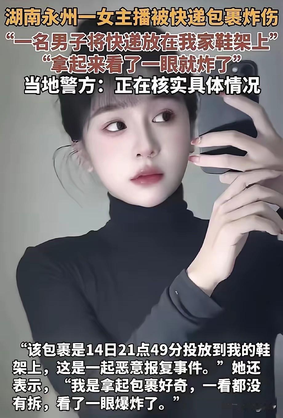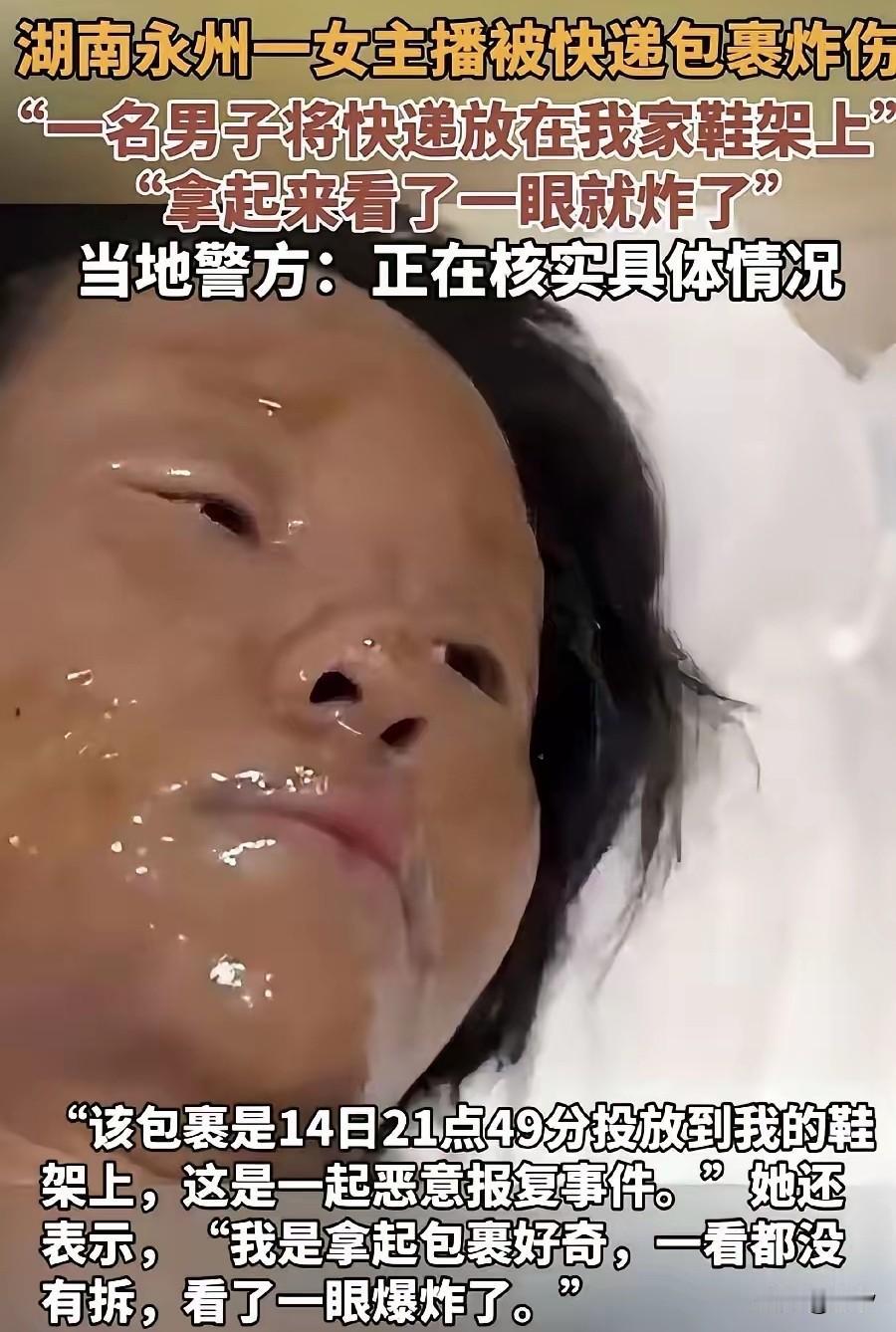 2025年10月15日,湖南永州市女主播周某某(31岁)在自家门口取包裹时,被伪装成快递的易燃物品炸伤,导致面部深二度烧伤、手臂深三度烧伤。犯罪嫌疑人刘某强(27岁)因个人矛盾制造该事件。据披露,刘某强曾通过直播间打赏、提出相亲等方式追求周某某,但被拒绝后持续骚扰,包括退还600元礼物后仍纠缠。永州市公安局冷水滩分局于10月16日通报:刘某强因涉嫌故意伤害罪被刑事拘留,案件正在侦办中。等警方通报案件经过,上面的和文章所说都是一方之词。