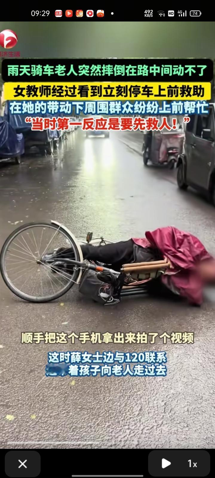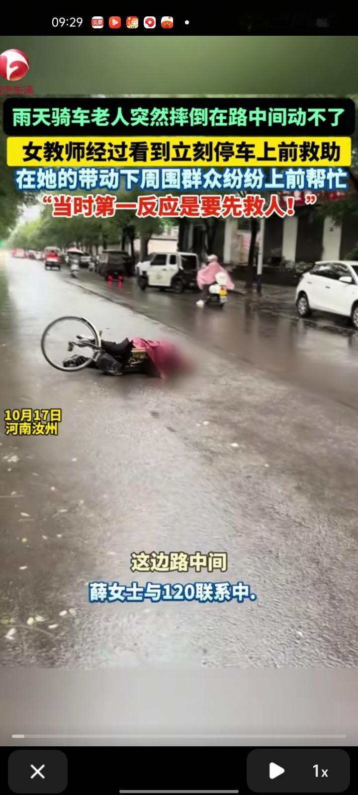 10月17日,平顶山汝州市。早高峰又下雨,一位老人摔倒在路中间动弹不得,女教师看到后立刻拨打120,还用另一个手机拍摄,主要是因为自己怕被讹。在她的带动下,周围群众纷纷上前帮忙。女教师表示,希望这个社会有更多爱心人士以后遇到这个问题能帮一把是一把,但是要保证自身安全的前提下去帮忙。