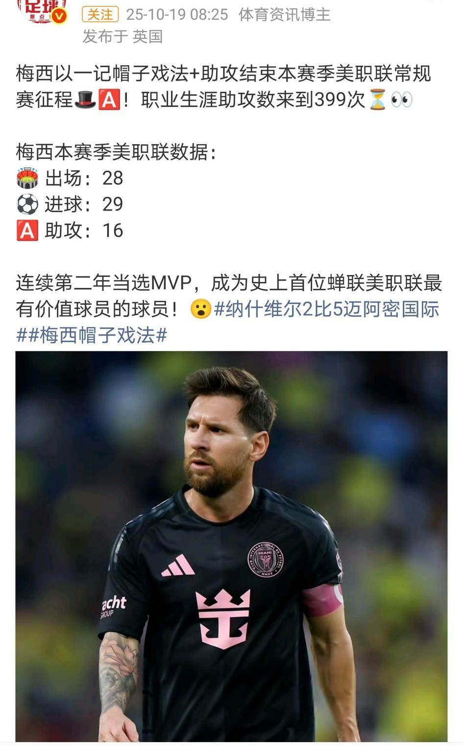 梅西续约还得等等!季后赛成绩好才是硬道理……虽然他是史上首位蝉联美职联最有价值球员的球员! 梅西本赛季美职联数据: 出场:28 进球:29 助攻:16 迈阿密国际常规赛排名第三,季后赛再次对阵今天的对手纳什维尔,三局两胜制。