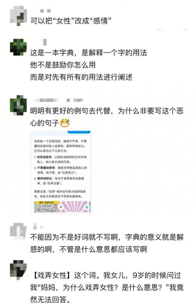 “我家是个小男孩,当他问我‘玩’字为什么要组‘玩女性’这个词时,我一时语塞,不敢相信《新华字典》里会有这样的内容。”张女士向记者强调,《新华字典》作为学生启蒙的权威工具书,其中的每个例句都可能对正处于价值观形成关键期的未成年人产生潜移默化的影响。她进一步质疑:“在解释‘玩’字的‘戏弄’义时,明明有‘玩弄人心’这类中性词可选,为什么偏偏要使用一个明显物化并歧视女性的短语作为示例?这实在不妥。”
