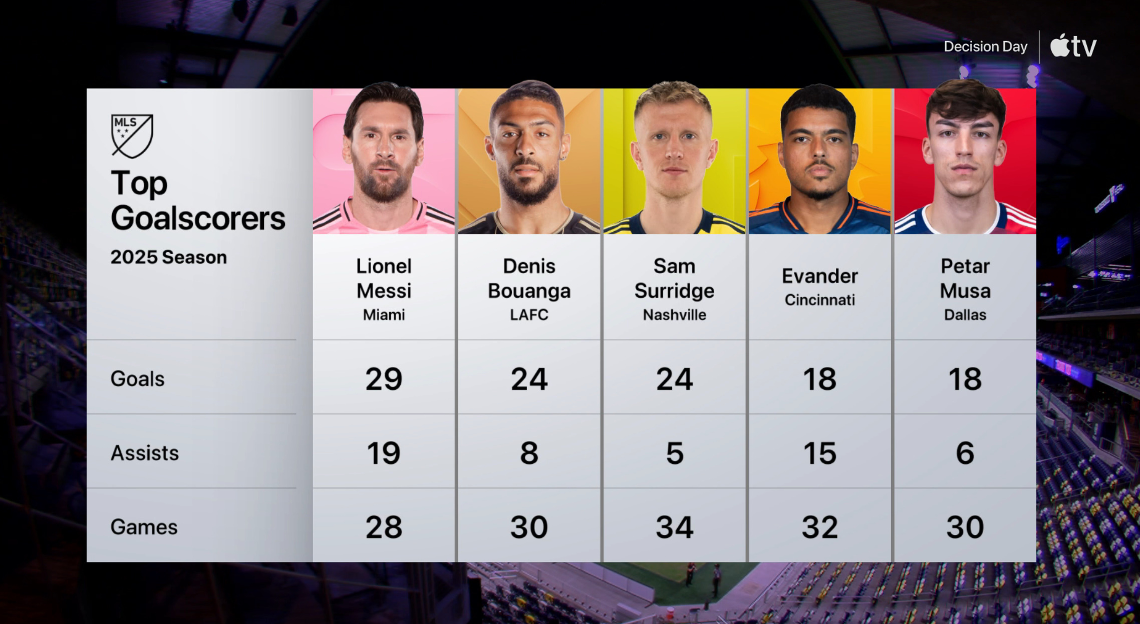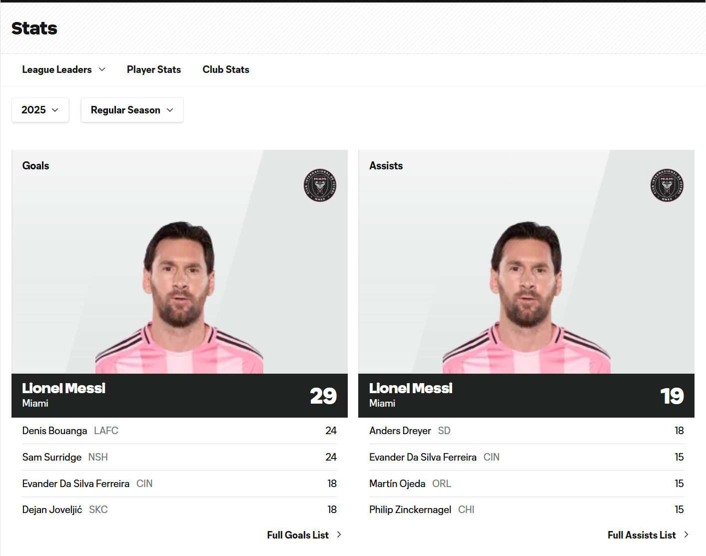 美职联官方有自己的助攻统计标准,目前梅西19次助攻领跑助攻榜,29粒进球领跑射手榜;西部的洛杉矶FC和圣地亚哥还有一场比赛。