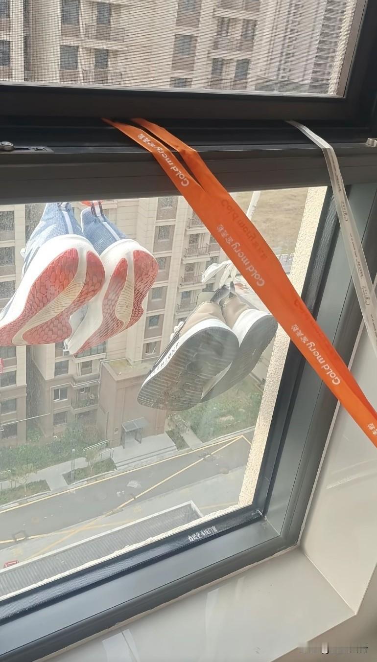 用丝带串一个圈,保证不会掉下去,而且10楼不是很高,下面是绿化带,一般不会有人在楼根底下走来走去 家里的蛋糕绳子派上用场了,天天想着怎么放出去,原来一根绳就可以解决,提前控好水份,晒薄被,晒枕头都这样,准备了一条很结实的绳子