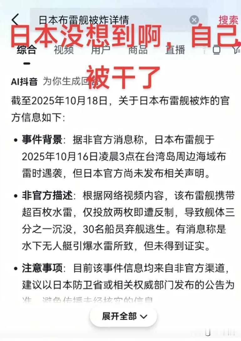 日本布雷舰被炸事件发生在16日凌晨3点,地点在台湾岛周边海域,涉事舰艇为日本海上自卫队的布雷 舰,可能是“浦贺号” 该舰在布雷过程中刚投放两颗水雷后,被水下无人艇盯上,随后引发 水雷爆炸,导致舰艇1/3沉入海底,30名船员弃船逃生。昨天在外网还刷到视频了,爆炸过程: 中间一发砰,看船上怎么还有个人晃悠,等了几秒在前面又一发,砰,然后看到船开始下沉。那几个人竟然往船里面跑了,当时还想,这沉了不得全死?他们好像完全不知道布雷的事情。疑似被无人艇引爆了两颗自己布的水雷沉了。 日本官方称布雷舰是触礁,但外界对此说法存疑。跑到我们家门口布雷,但当前的局势和16年相比又有太多的不同,总体而言,我们更加的强大了。如果它一心求死,那就新仇旧恨一起算