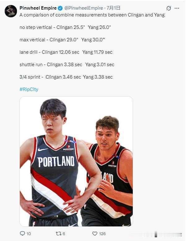 杨瀚森面对克林根优势巨大!新赛季有望抢过首发 开拓者季前赛四场打完,有球迷拿出了杨瀚森和克林根的数据对比: 克林根场均出场19.3分钟,可以得到7.5分9篮板1助攻1.3盖帽,投篮命中率44%,三分球命中率67%。 杨瀚森场均出场18.5分钟,场均可以得到8分3.5篮板1助攻1.3盖帽,投篮命中率46%,三分球命中率40%。 再看看两人的静态天赋和动态对比,克林根今年22岁,身高2.19,臂展2.29,体重128公斤,原地垂直弹跳25.5英寸,助跑最大垂直弹跳29英寸,敏捷度测试12.06秒,折返跑3.38秒,3/4场地冲刺3.46秒。 杨瀚森今年21岁,身高2.18,臂展2.24,体重123公斤,原地垂直弹跳26英寸,助跑最大垂直弹跳30英寸,敏捷度测试11.79秒,折返跑3.01秒,3/4场地冲刺3.38秒。 可以看出,杨瀚森作为新秀,他的进攻效率比克林根更高,克林根更倾向于一个蓝领中锋,而杨瀚森更倾向于一个全能型的大中锋,静态天赋克林根比杨瀚森更好,但是杨瀚森出克林根更快、更灵敏,动态天赋杨瀚森更加出色,个人感觉杨瀚森新赛季中段或者下半段极有可能取代克林根,坐稳开拓者的首发位置。
