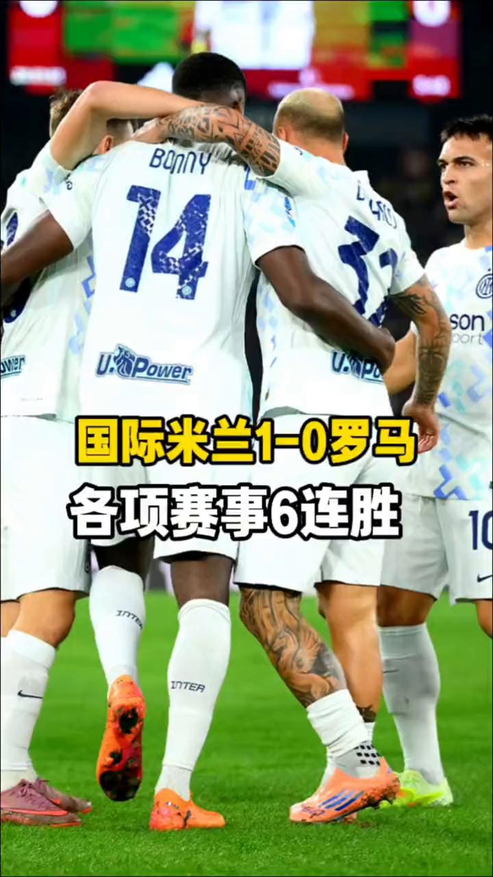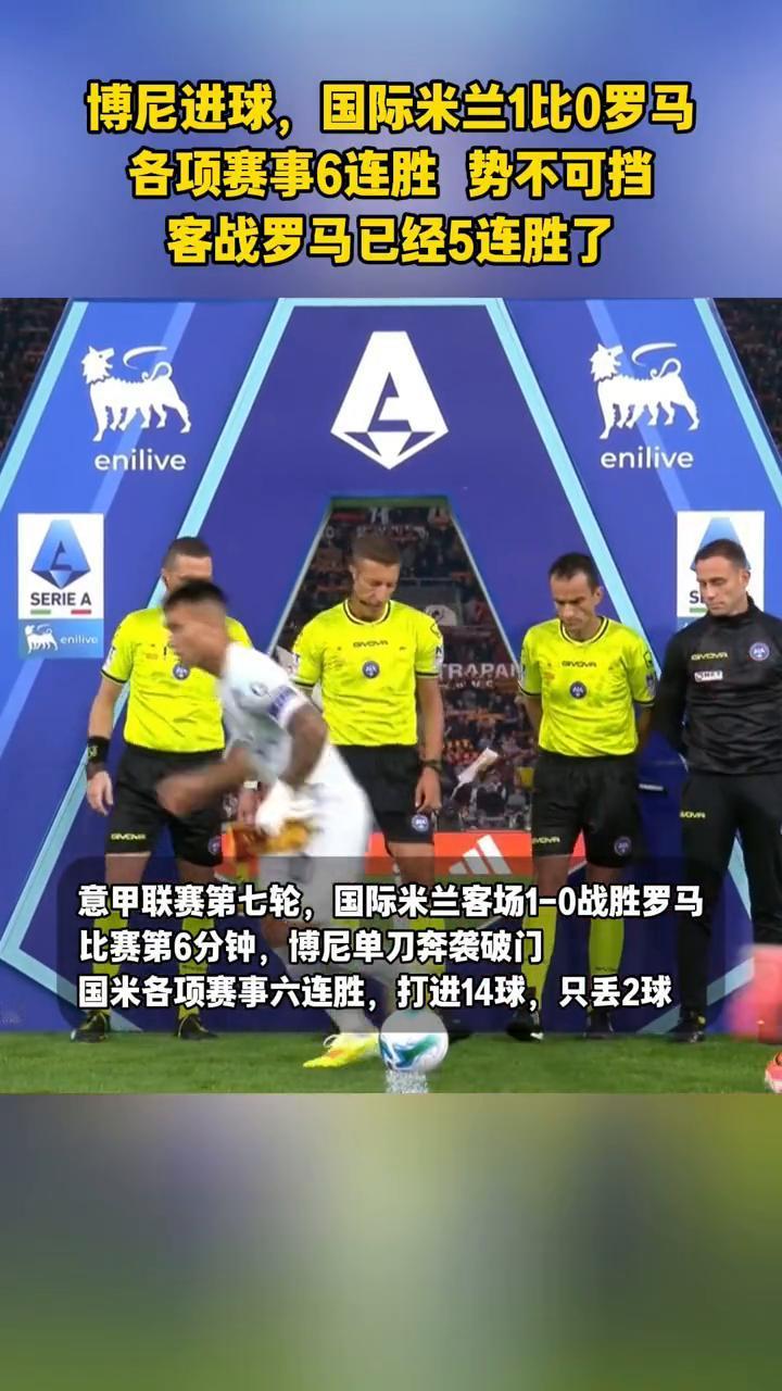 国际米兰1-0罗马,各项赛事6连胜。 博尼进球,国际米兰1比0罗马,各项赛事6连胜势不可挡。客战罗马已经5连胜了。意甲联赛第七轮,国际米兰客场1-0战胜罗马。比赛第6分钟,博尼单刀奔袭破门。国米各项赛事六连胜,打进14球,只丢2球。意甲赛场,唯一客场5连胜罗马的球队。国米在客场连续5次击败罗马,打进11球仅丢2球堪称罗马克星。