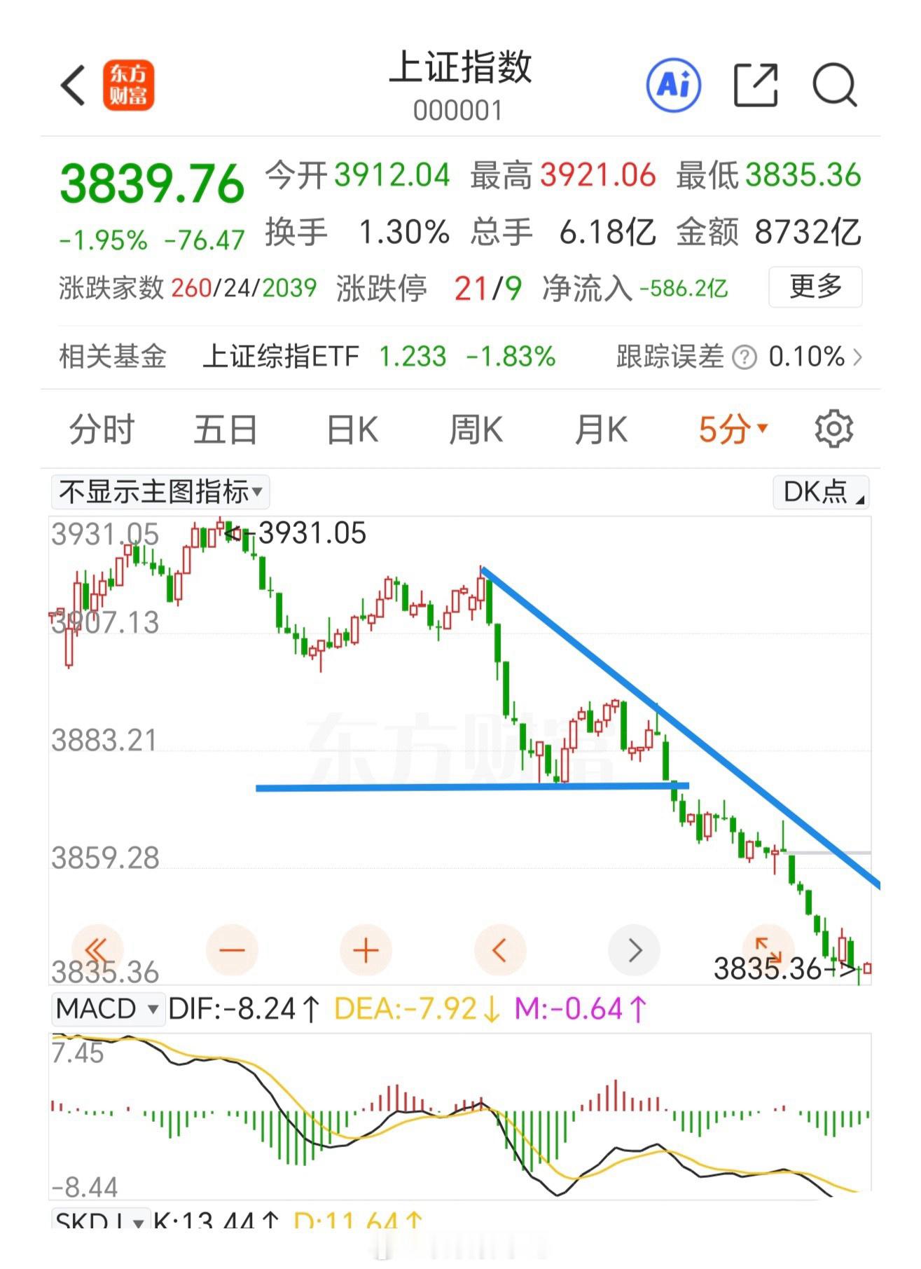 上证指数下跌是以微5浪的方式运行,没有产生中枢(1分钟级别),周一反抽要到3876点以上还是可以的,反抽连3876也碰不到视为弱势,后续将破新低。