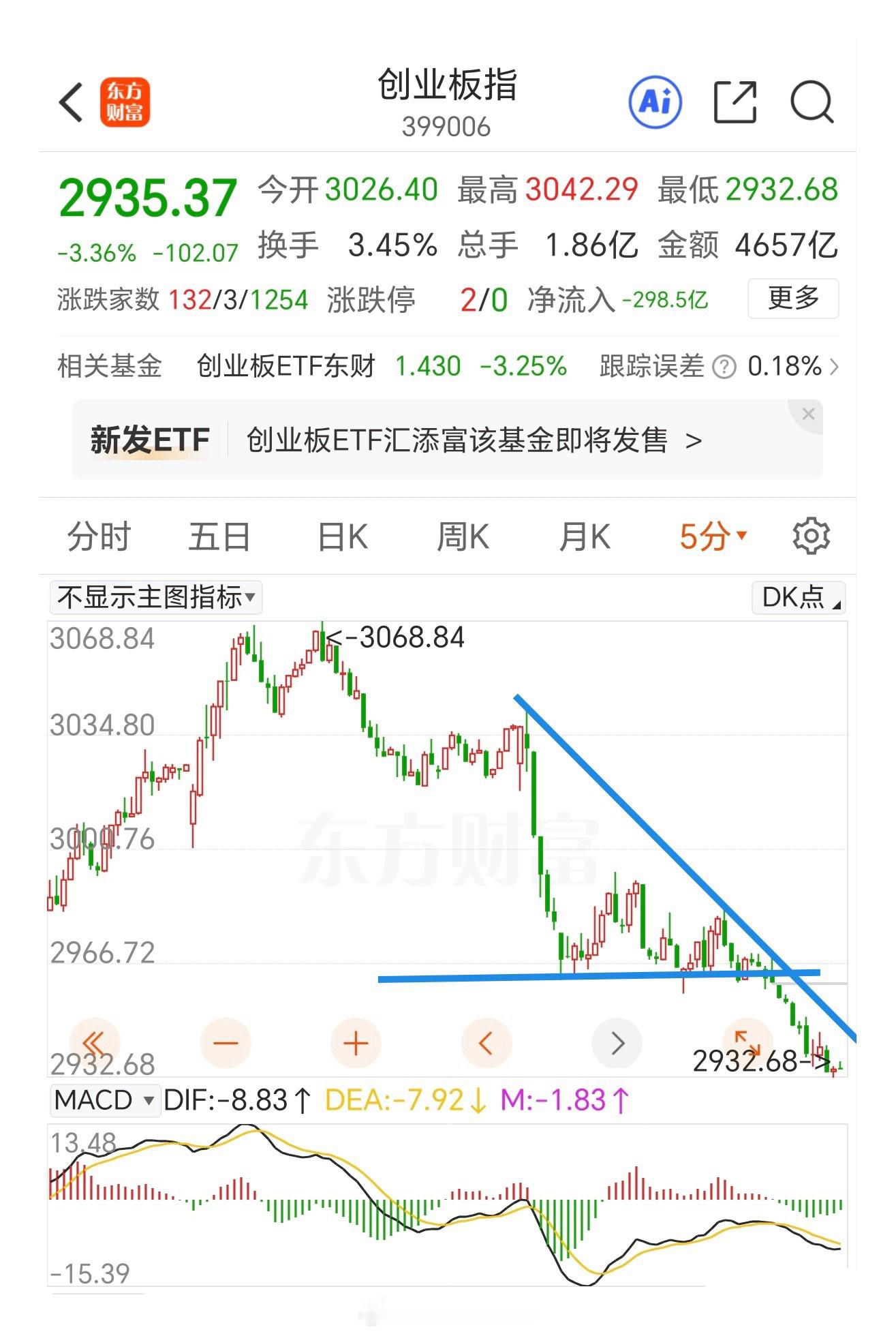 创业板和科创走势结构类似,5分钟macd底背离,skdj指标打到超卖区域,反弹的动能会大一些,关键点位在2962点,涨幅超1%就差不多。