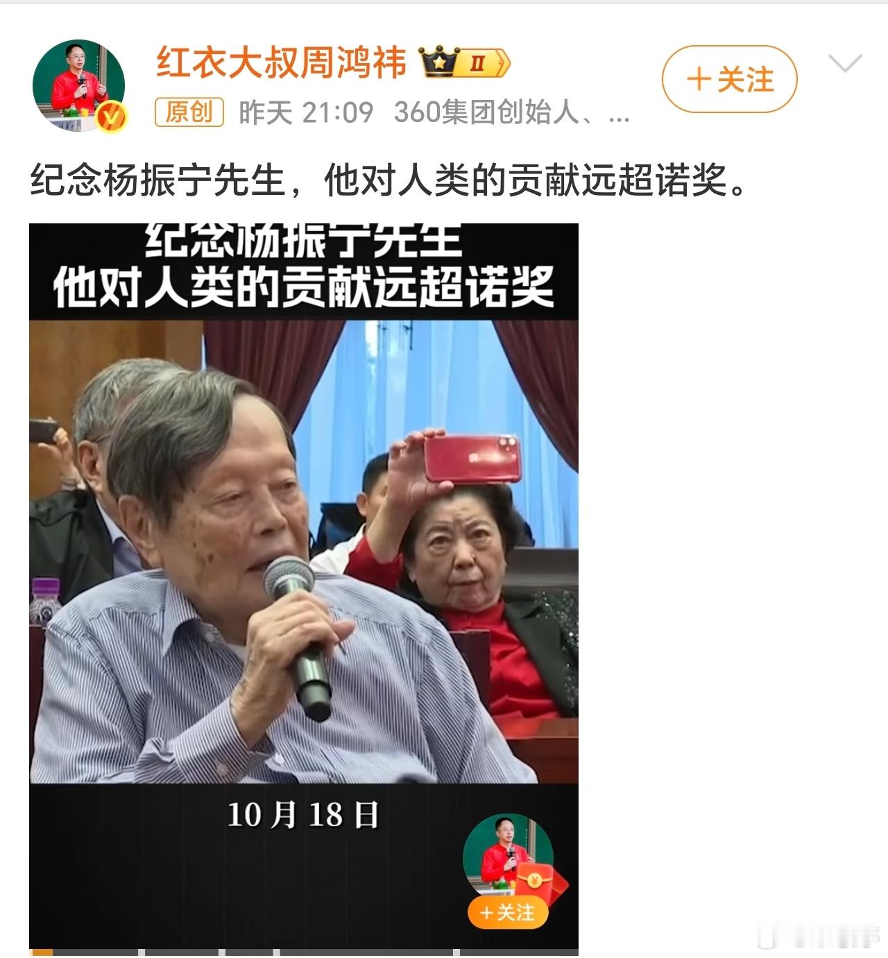 周鸿祎说他的贡献远超诺奖这是实话,说有诺贝尔奖获得者因诺奖而荣耀;而杨振宁的贡献是让诺贝尔奖荣耀的人。即便许多诺奖获得者都是在其理论突破上获取的[并不简单]!