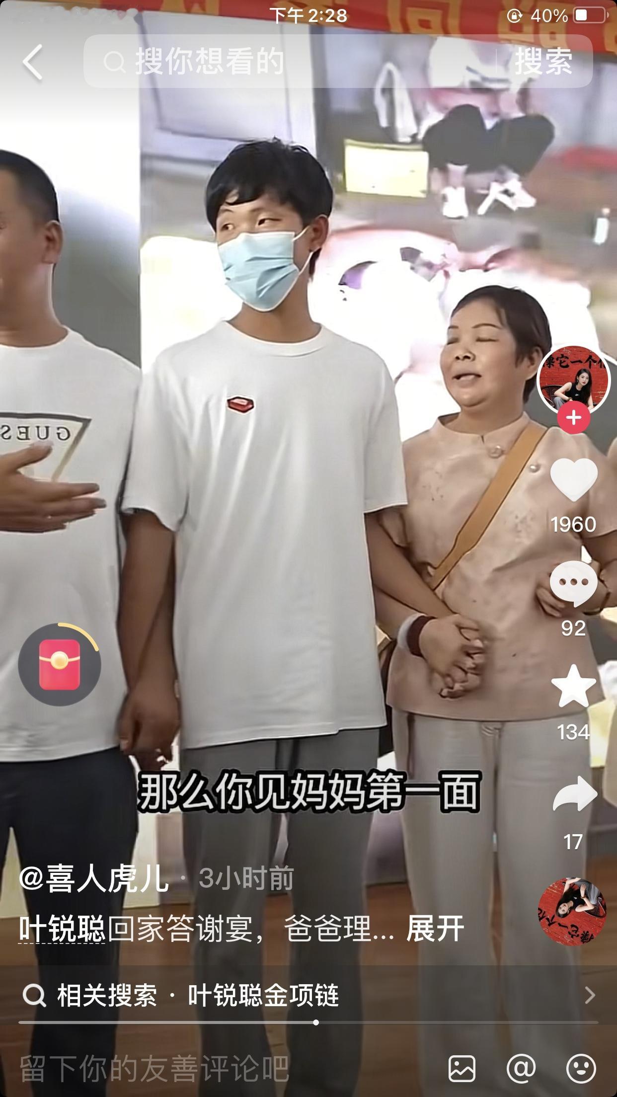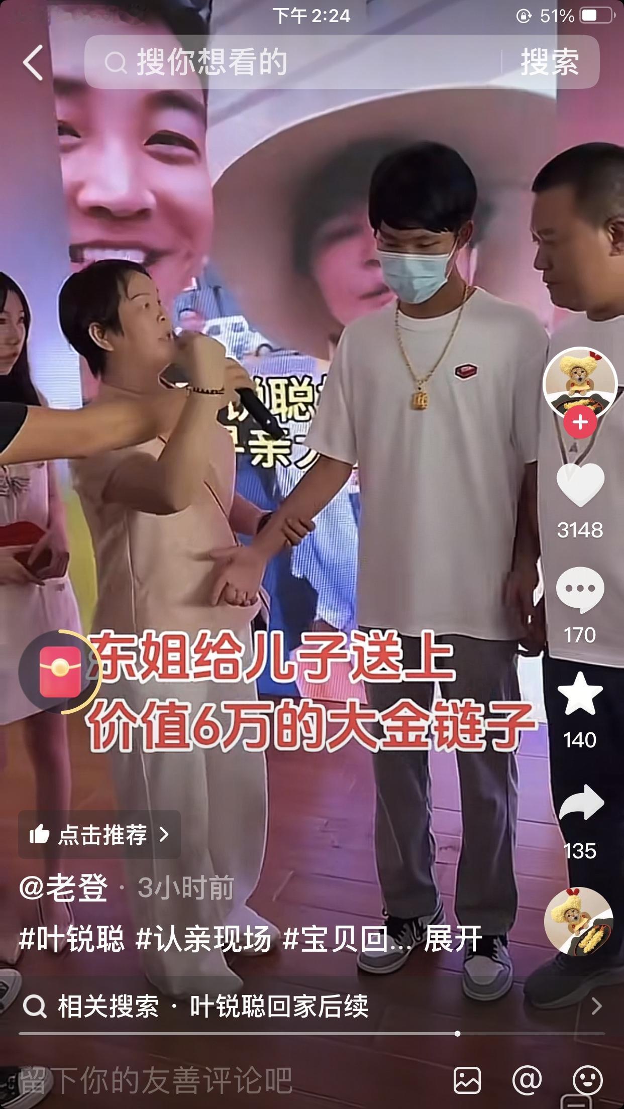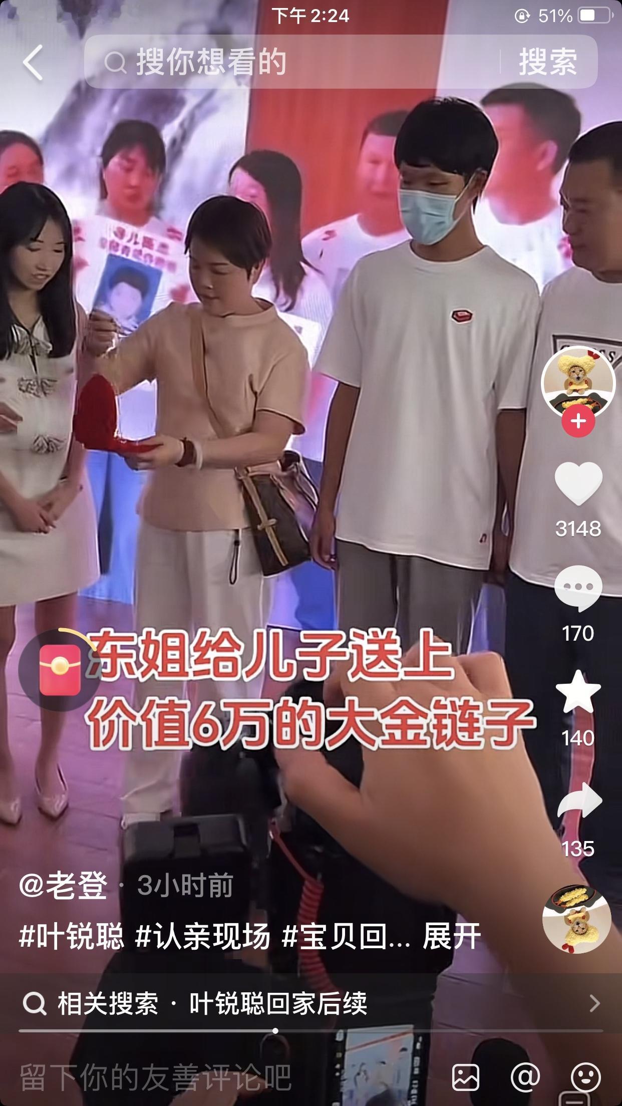 叶锐聪回家礼物收到手软,妈妈大喇叭东姐给儿子叶锐聪房子一栋,6万块大金链子一枚。被抢的时候脖子上就带一个很大的金牌,现在妈妈给买一个更大的。 这才是真正的认亲!父母全家及所有亲戚陪伴,还给孩子买了一个那么大的金链子,儿子房子装修一心。老谢家的认亲宴实在无语,亲妈不让出场,送给浩男的都是大饼。并迫不及待地让郑三出场为三直播带货赚钱,利用儿子……