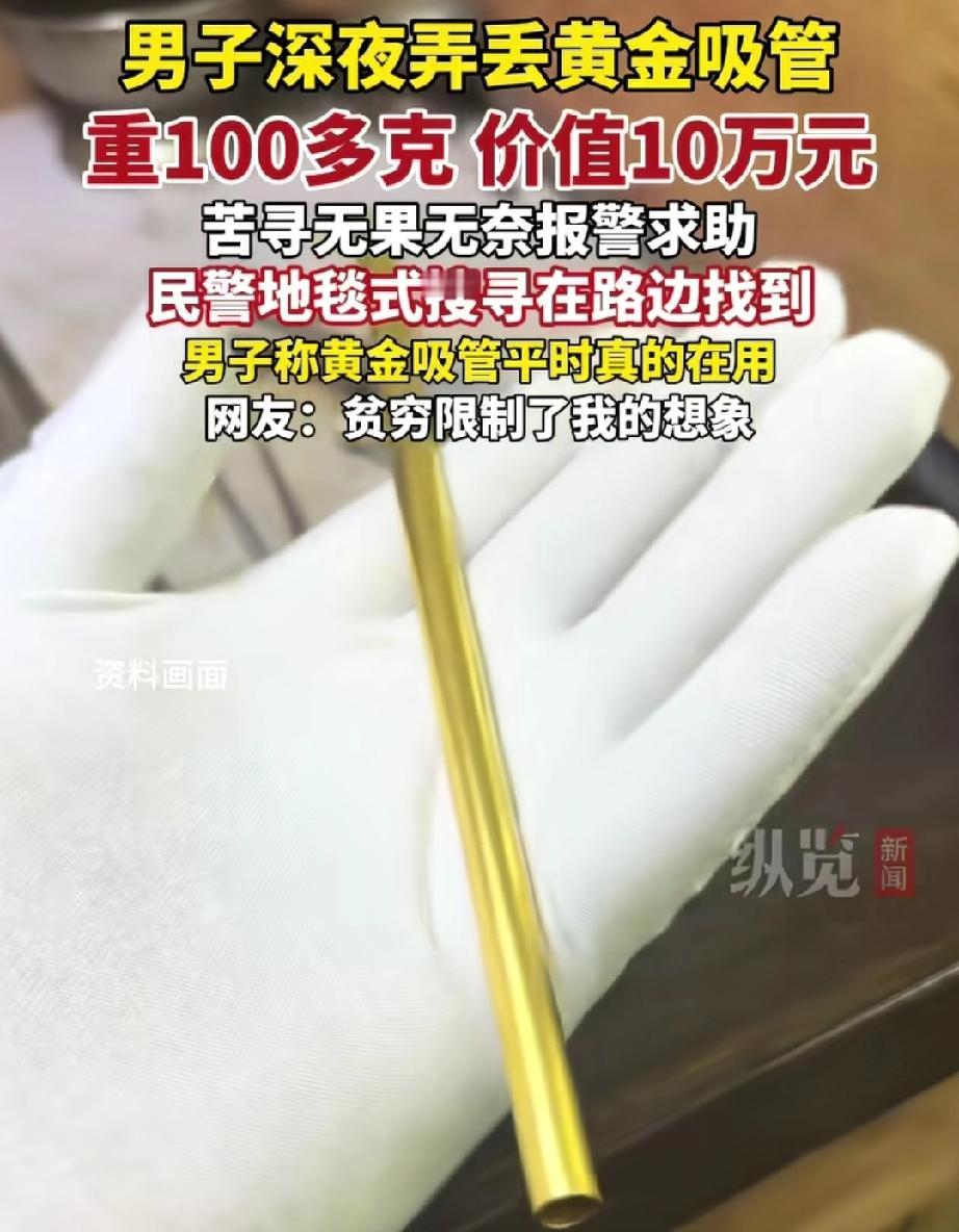见过金碗、金勺子,金筷子,还是第一次见“金吸管”。 近日,浙江寿先生骑着小电驴回家,车轮压过井盖时的颠簸,让他兜里的吸管跌落,这根吸管重100多克,质地为黄金,价值10万元。他原路折返,苦寻近半小时,却一无所获,最终无奈报警求助,在民警的帮助下,最终在路边找到了黄金吸管。 有网友说,贫穷限制了想象,其实不然。贫穷实际上只是一种状态,它并不可以限制你的想象力。 董宇辉曾说,生活从来没有刻意为难你,是你的认知程度阻碍了你。 限制你想象力的,从来只有你的认知能力。常常听说,人在这一生当中其实都在为自己的认知买单。 你手上所赚的每一分钱,靠的都是你的认知能力;反之你手上所亏的每一分钱,看似是因为你的能力不足,实则是你对挣钱的认知能力有所缺陷。 你要知道你脚下是什么地方不重要,提升自己才是根本,踩着垃圾到达的高度和踩着金子到达的高度是一样的。 不要把提升自己的时间,浪费在抱怨别人的消耗里。 所谓见过世面,不是指曾经经历过的花天酒地,品尝过的山珍海味,也不是一次说走就走的旅行,而是你饱经世事,尝遍酸甜苦辣,经历风雨,拥抱彩虹以后所拥有的一份宁静、坦然。 所以,不要让贫穷限制了你的想象力;不要让高度限制了你的视野。 提升自己,提高自己的认知,才是我们所有人最该做的事! 认知 黄金
