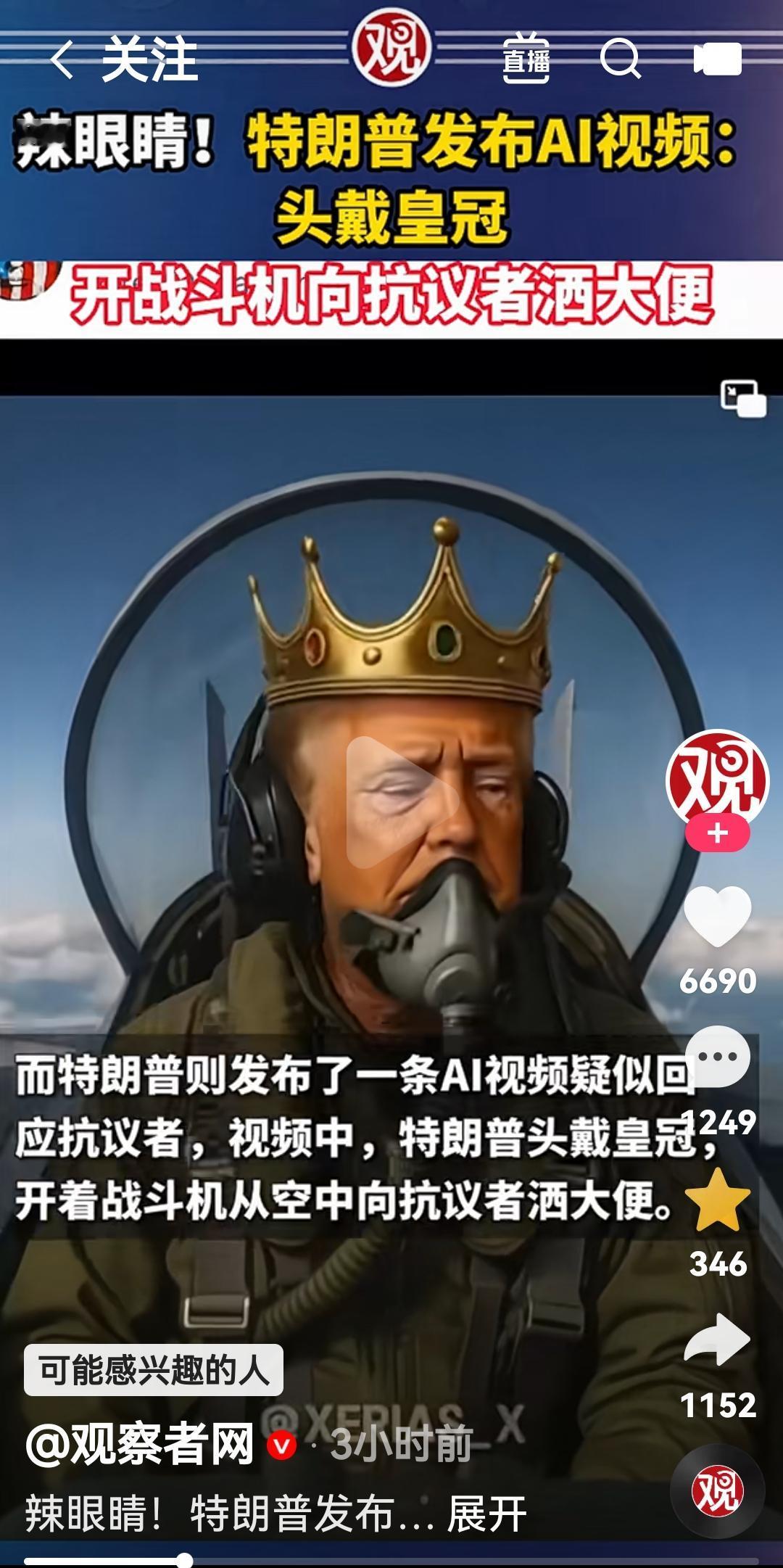 特朗普制作AI视频开战机向游行示威者撒大粪,自己还头戴皇冠👑 根据美国媒体报道