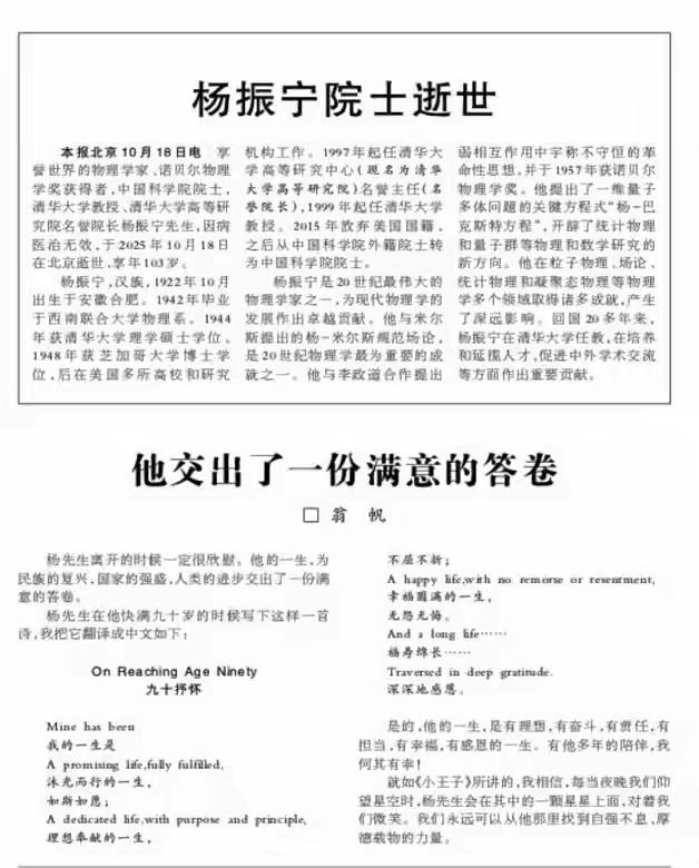 杨振宁去世,翁帆的文章让我们看到了浪漫爱情的模样 昨天,一个伟大的物理学家去世