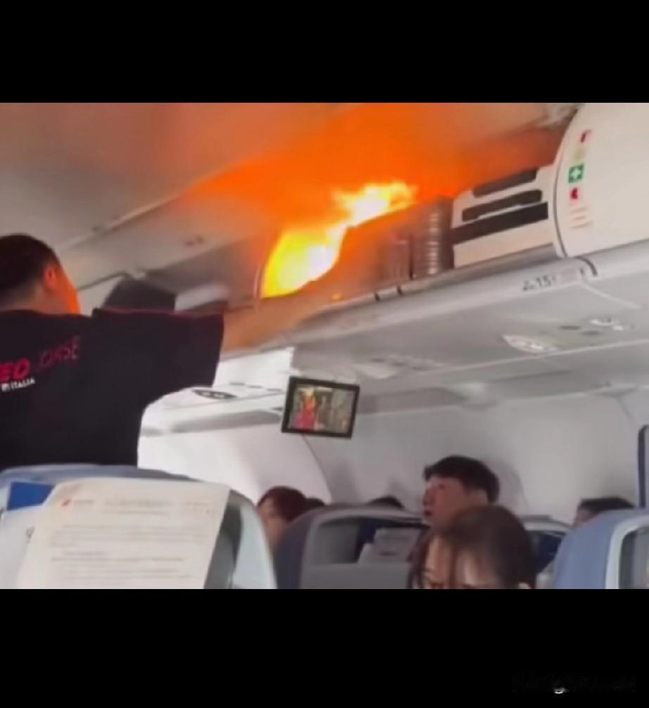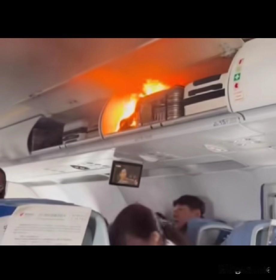这是在飞机上,乘客包里的锂电池自燃了,现场的人面面相觑,不知如何是好,显然都没有经历过这样的场面,要知道,这可是在飞机上,在机舱内发生这样的火灾,实在是太危险了,看到这样的画面,真是够吓人的了,最后不知道是如何处置的,希望啥事没有!