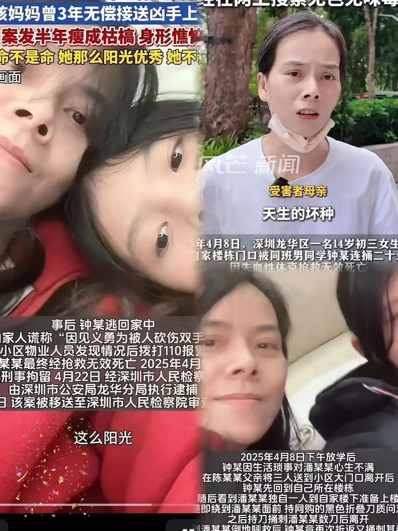 杀害女同学男生求饶 今年四月八号 这场悲剧让人痛心疾首! 15岁初中生钟某, 竟在女同学楼下对其痛下杀手, 26刀啊 然而,令人震惊的不仅仅是这起血腥的案件,更是背后隐藏的人性深渊。15岁的钟某,年纪轻轻,却已踏入了如此黑暗的深渊。或许有人会问:一个还在懵懂无知的少年,怎么会走到这一步?这背后,或许隐藏着家庭的阴影、学校的冷漠、社会的压力,也许是成长中的迷失与扭曲。 但更令人心碎的是,案件发生时的那一幕:男生在求饶,泪水模糊了视线,嘴里不断哀求“放过我”,却换来的是无情的刀刃。这一瞬间,仿佛让我们看到了人性最阴暗的一面——在极端的情绪驱使下,善恶的界限变得模糊不清。我们不禁要问:如此年轻的生命,为何会走到如此绝望的边缘?而我们每个人,又是否曾在无形中,忽略了那些在成长道路上迷失的孩子们的心声? 这起案件折射出的问题远比表面更复杂。它提醒我们,青少年的心理健康、家庭教育、校园环境,都是不可忽视的社会责任。我们是否真正关心过那些在角落里孤独挣扎的孩子?我们是否用心倾听过他们的内心世界?还是只在事发后,才慌乱地追问“为什么会变成这样”。 正如社会的每一次震动,都在提醒我们:成长不应成为伤害的借口,而应是温暖和引导的起点。我们期待,社会、家庭、学校都能成为孩子们坚实的后盾,让他们在阳光下自由成长,而不是在阴影中迷失。因为,每一个生命都值得被尊重,每一个少年都应拥有希望的未来。 这起悲剧,或许让我们心碎,但更应成为反思的契机。我们能做的,不只是哀悼,更是行动。让我们用关注和爱,去守护那些需要帮助的孩子,让他们在阳光下,勇敢面对未来。对此,你有什么看法?咱们在评论区交流未成年人杀人 少年砍人事件