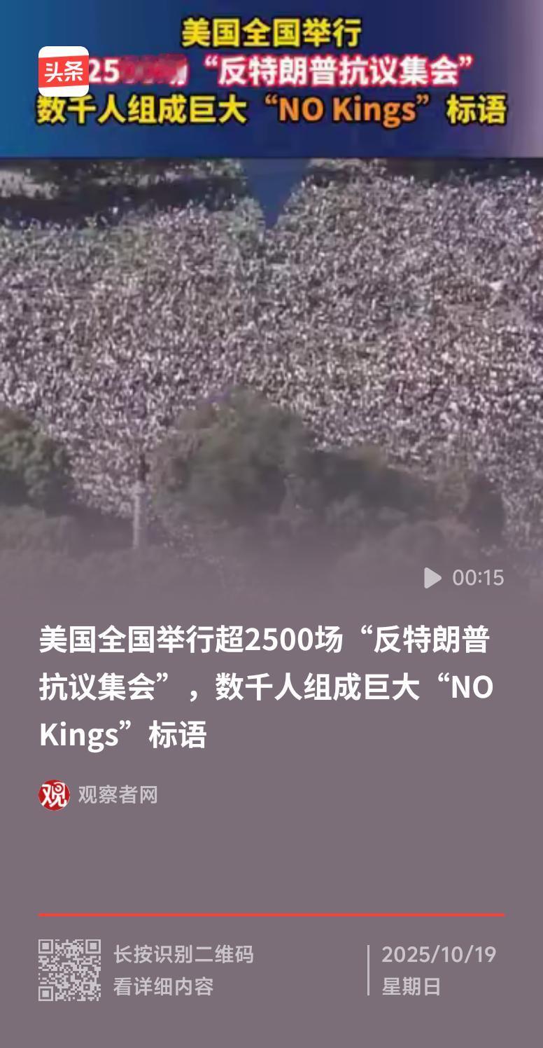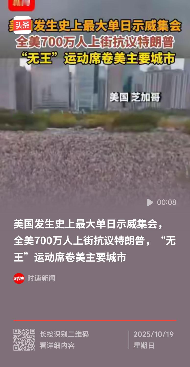 当地时间10月18日,美国爆发大规模抗议活动,约700万人参与,这可能是特朗普重返白宫后规模最大的一次全国性示威。美国联邦政府“停摆”第三周,民众生活受影响,不满情绪加剧。 抗议活动在全美50个州超2600个地点举行,涵盖各大主要城市,一些民主党政治人物也加入其中。示威者喊着“不要国王”口号,举着“没有什么比抗议更爱国”等标语。共和党谴责这是“仇恨美国”集会。若700万人数属实,这将是美国60年来最大规模示威之一,可见美国内部矛盾之深。 欧洲抗议活动 美国游街抗议 美国大示威