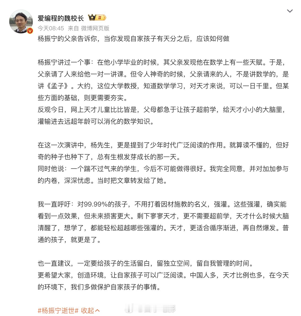 杨振宁父亲看到这条热搜,杨振宁父亲给他请奖孟子老师一对一,而不是逼他刷题,突然有点感慨。作为三岁娃的妈,这种“先养心性再谈学问”的做法,确实比填鸭高级多了,原来杨振宁他爸小时候是这么带他的。