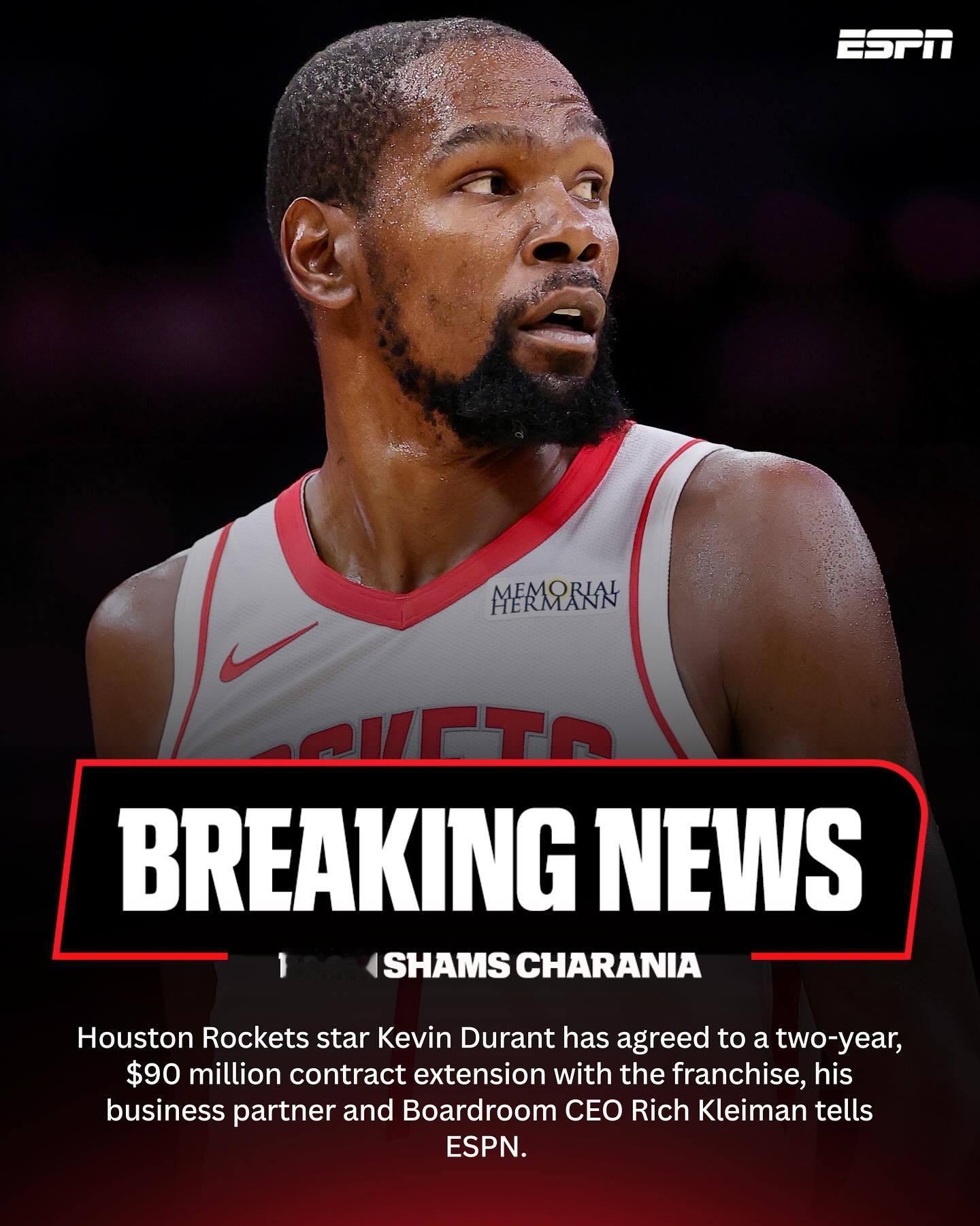 杜兰特与火箭达成2年9000万续约合同,其中27-28赛季为球员选项。