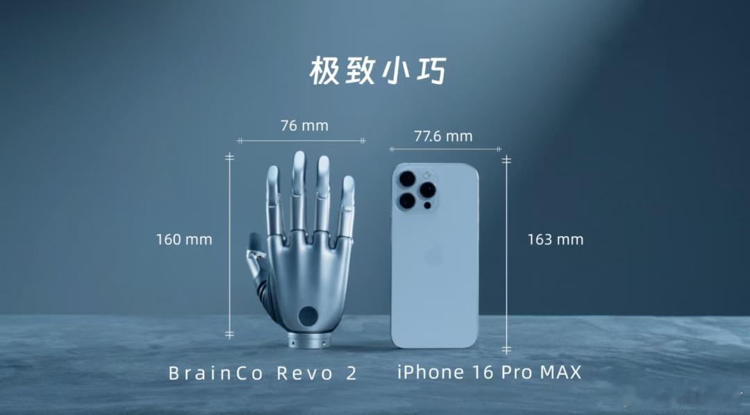 在此基础上,强脑科技也将积累多年的仿生结构与控制技术拓展应用至人形机器人领域,2025年4月发布的仿生灵巧手Revo 2已凭借其卓越的整体性能树立了行业标杆。作为目前最轻的专业级灵巧手,Revo 2整机重量仅383g,相当于6个鸡蛋的重量,尺寸与iPhone 16 Pro Max接近(76mm×160mm)。