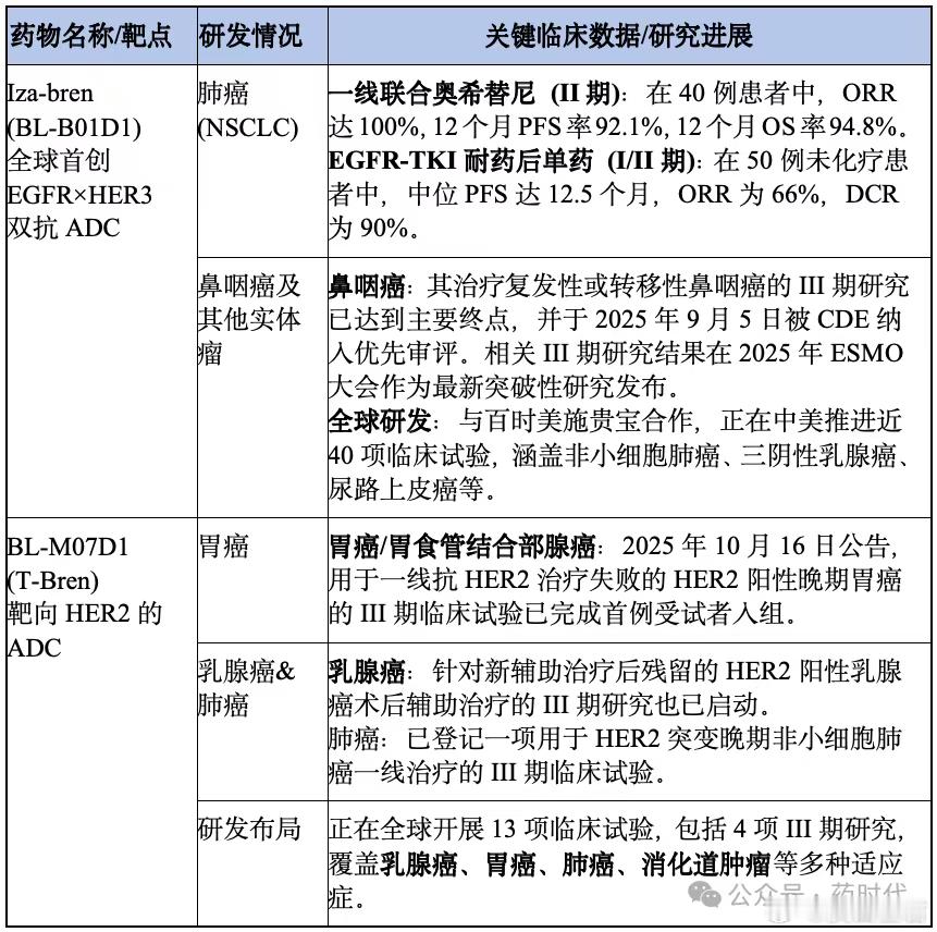 表6 4款ADC药物目前已公开的临床数据其中百利天恒的Iza-bren (BL-B01D1)作为全球首个进入III期临床的EGFRxHER3双抗ADC,其在非小细胞肺癌、乳腺癌、卵巢癌等多个实体瘤中展示了令人鼓舞的疗效和可控的安全性。这获得了FDA的突破性疗法认定,并与BMS达成全球合作,是中国创新“出海”的标杆;BL-M07D1:作为一款具有“同类最佳”潜力的HER2 ADC,其在乳腺癌和胃癌中的数据也入选了本次大会的展示。