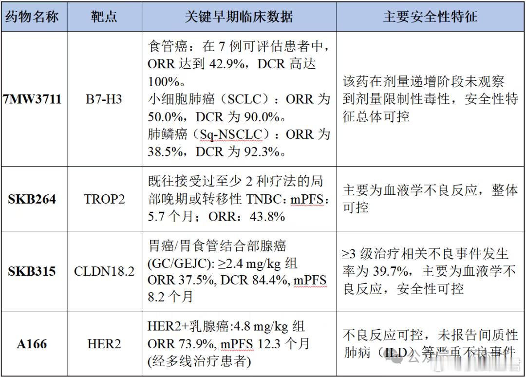 4.1临床数据大爆发7MW3711 (迈威生物,靶向B7-H3的ADC)、TQB2102(中国生物制药,靶向HER2的ADC)、SKB315 (科伦博泰,靶向CLDN18.2的ADC)、SKB264(科伦博泰,靶向TROP-2的ADC)、A166(科伦博泰,靶向HER2的ADC)、BL-B01D1(百利天恒,EGFRxHER3双抗ADC)等,在Mini Oral或Proffered Paper环节公布临床试验数据,展示了良好的疗效和安全性。