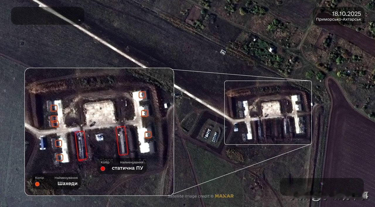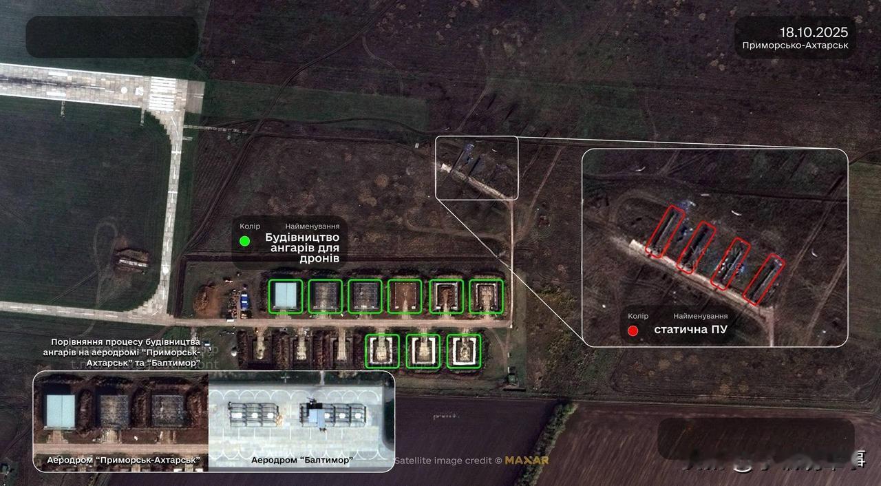 乌方发布的俄罗斯克拉斯诺达尔边疆区普里莫尔斯科-阿赫塔尔斯克机场的卫星照片,显示了用于停放军机和自杀式无人机的机库。 画面中有几处固定发射装置用于自杀式无人机(红色标注),至少21架已做好发射准备的“天竺葵-2”型无人机(橙色标注),还有两种类型的无人机机库——5个已建成和9个正在建设中的大型无人机机库(绿色标注),每个机库至少可容纳20架自杀式无人机,以及几个小型机库,可容纳1-2架无人机(黄色标注)。 此外,机场还建有数个用于苏-35S、苏-30SМ和苏-34战机的机库。此前乌方已多次发布该空军基地在建造机库和发射位置过程中的照片(1,2,3)。 可以看出,普里莫尔斯科-阿赫塔尔斯克实际上兼具机场和无人机港口的功能,且正积极扩建。这意味着一件事——未来同时向乌克兰发射的“天竺葵”型自杀式无人机数量只会增加。 来源:军事情报员 俄罗斯无人机 俄式无人机