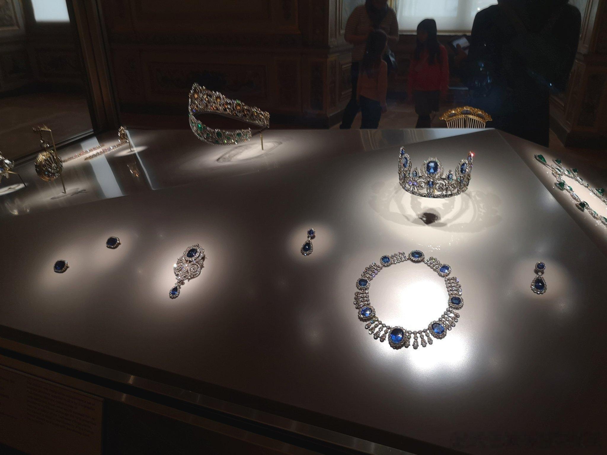 图3:法国奥尔良家族蓝宝石套装(Orléans Sapphire Parure):一顶蓝宝石王冠及其对应的蓝宝石项链和耳环(图3除了左侧的三枚胸针,其他全偷了),该套装曾属于法国皇后约瑟芬之女,荷兰王后奥坦丝·德·博阿尔内,后归法国王后玛丽-艾米莉所有,1985年,巴黎伯爵亨利将蓝宝石套装卖给卢浮宫(现任巴黎伯爵让发公告表示对珠宝盗窃的关切,表示这曾是属于他祖母伊莎贝尔的珠宝)