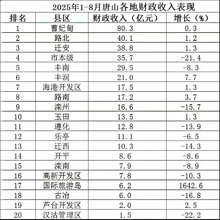 2025年1-8月唐山各区县财政收入出炉:迁安超市本级、旅游岛增速喜人、开发区超