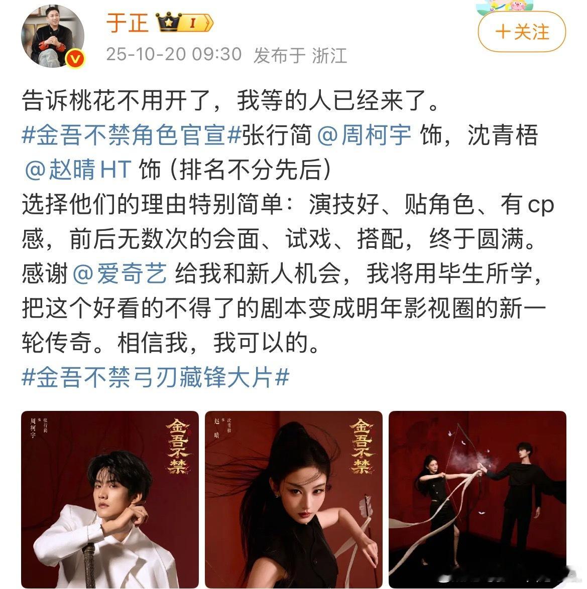《金吾不禁》官宣,周柯宇和赵晴平番。于正说这是好看的不得了的剧本,他们也不是新人