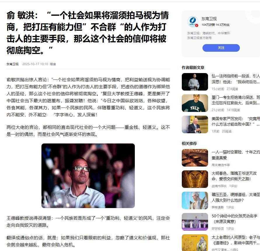 俞敏洪说:“一个社会如果将溜须拍马视为情商,把利益输送视为协调能力,把打压有能力但‘不合群’的人作为打击人的主要手段,把虚伪的道德作为绑架他人的圣经,那么这个社会的信仰将被彻底掏空。” 复旦大学教授王德峰,更是撕开了中国社会当下最大的遮羞布,他说:“今日之中国纵欲汹汹,各种欲望,各食其能,各谋其力,如果一个民族的民风,伴随着重功利、轻道义,这个民族将内不能安,外不能立……”字字诛心,发人深省! 俞敏洪和王德峰的言论精准戳中了当下社会的痛点,所谓“重金钱、轻道义”从来不是空洞的指责,而是渗透在各行各业的真实景象,从日常消费到教育公益,几乎处处可见功利压倒良知的痕迹。 就说最贴近生活的商业领域,科尔尼发布的《生活用纸品类电商白牌白皮书》揭露了一场“自杀式内卷”:过去十年生活用纸产能利用率从88%跌到60%以下,CR4头部品牌市场份额才30%-35%,大量中小白牌为抢流量陷入无止境的价格战。 河北有家纸厂老板为驻留低价电商平台,被迫“每天降五毛”,一年亏光三年利润,最后只能关停撤店。更离谱的是四川某纸厂代工的湿纸巾,从45克一路降到35克,客户直言“能擦就行”,根本不在乎用料安全。 消费者买到的纸巾藏着各种雷:退休教师下单的“680张纸抽”实际不足250张,缺斤少两超65%;新手妈妈囤的婴儿纸巾有黑色异物,医生说是微生物严重超标;程序员秒杀的低价纸巾用紫外线一照泛蓝光,竟是添加了荧光增白剂的劣质品。 这些乱象直接反映在投诉数据上,黑猫平台相关投诉年增幅高达67%,而商家对此只懂“仅退款”,对质量问题避而不谈,毕竟在他们眼里,赚钱比守住底线更重要。 更讽刺的是,有家西南纸企投千万研发环保竹纤维纸品,却被用芦苇浆仿冒的低价产品挤出市场,创新败给造假,道义输给功利。 教育领域的功利化更赤裸,俞敏洪说的“虚伪包装”在这里演变成赤裸裸的欺诈。有家名字里带“清大”的教育科技公司,明明和清华大学毫无关系,却靠名称碰瓷、场地选在名校周边、发假结业证书等套路,把“总裁研修班”包装成“精英俱乐部”,专割渴望身份认同的韭菜,直到被市场监管局罚10万才露出马脚。 这还不是个例,连清华大学经济管理学院院长都有人冒充,可见“蹭名校光环”已成赚快钱的捷径。 更荒诞的是长沙有家教育公司,专门招员工在社交平台发“再见字节,月薪4w离职了”的虚假文案,配张蹭拍的字节LOGO合影,冒充大厂离职员工卖7880元的Python课程,把“撒谎”当成引流技巧,最终因不正当竞争赔了5万。 这些机构根本不在乎教学质量,只把“造人设”“蹭光环”当核心能力,合着所谓的“高端教育”,本质就是贴着名校标签的“智商税”。 公益领域本应是道义的高地,如今也成了部分人敛财的赛场,完美印证了王德峰“纵欲汹汹”的判断。 民政部公布的8起典型案例里,藏着各种花式骗术:“中国慈善联合会东平服务站”冒用合法组织名义,伪造奖章证书,搭APP搞“慈善投资”骗钱;“长泰区慈善会”碰瓷正规慈善总会,挂块牌匾摆个功德箱就敢收钱;“中华志愿者协会溆浦服务站”虚构助学项目,宣称“交5000元读本科包分配”,把贫困家庭的希望当生意做。 这些非法组织吃透了公众对公益的信任,把“行善”的道义包装成“圈钱”的工具,等于是在透支整个社会的善意。 更可怕的是,这种“伪公益”并非个案,而是形成了套路:要么冒充国字头机构,要么碰瓷合法组织,用温情话术掩盖逐利本质,让真正需要帮助的人难获援助,也让愿意行善的人不敢伸手。 这些现象凑在一起,就构成了两位大佬口中的社会困境。这样的风气下,信任成了稀缺品,道义成了笑话。 而当一个社会连纸巾安全、教育诚信、公益纯粹性都要反复求证时,所谓的信仰确实在一点点被掏空,毕竟当金钱成了唯一的尺子,道义自然就没了立锥之地。
