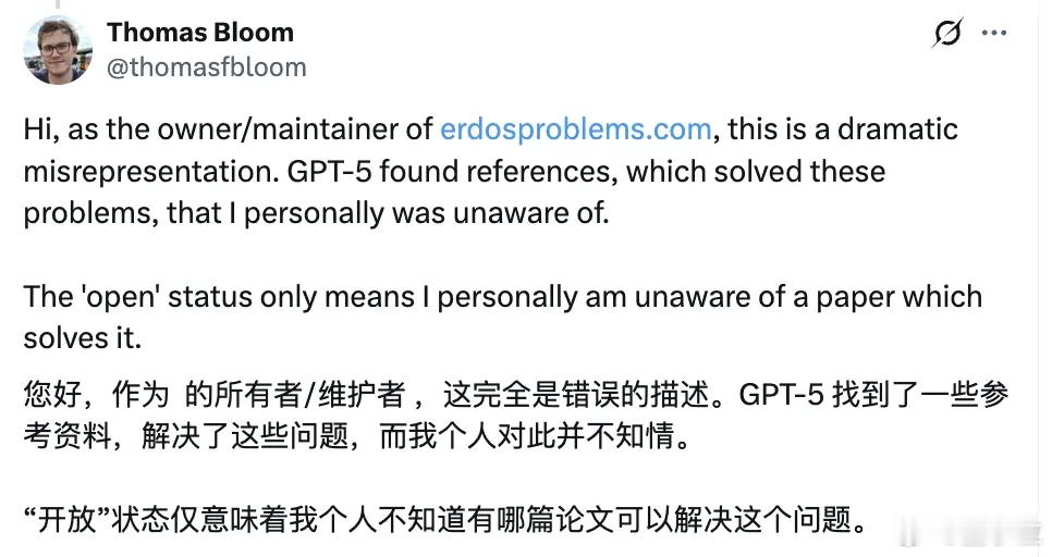 厄尔多斯难题网站的创办者亲自出来澄清【图2】:所谓“未解”,只是网站没更新,不代表学界没有解答。GPT-5是搜到了已经发表的论文,并非独立推导。