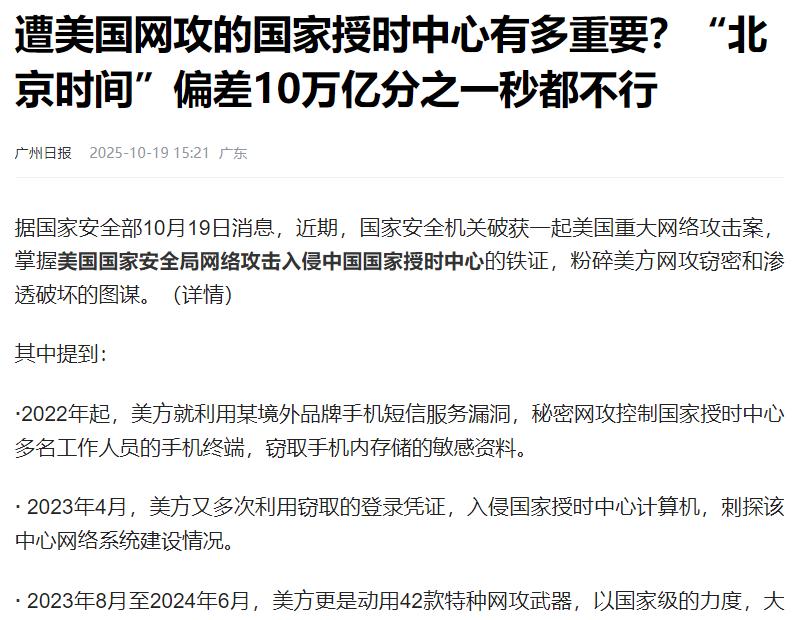 老美亡我之心不死,竟然于深夜,趁着我们都在熟睡的时候,攻击我们的中国科学院的授时中心,也就是确定基准“北京时间”的机构。 这场攻击是从2022年开始的,且路径相当隐蔽。他们先是盯上了境外某手机品牌软件的服务漏洞,偷偷获取了国家授时中心工作人员手机里的敏感资料。 拿到这些“钥匙”后,他们又顺势用工作手机的登录权限,侵入了授时中心的计算机系统,甚至专门搭建了新型网络作战平台,调出42款特种网络攻击武器,对着授时中心的多个网络系统发起了高强度攻击,每一步都透着早有预谋的险恶。 而这种连环操作一旦得手,整个国家的正常秩序都可能被打乱,后果不堪设想。 就比如大家平时刷手机、打电话,靠的是通信网络的时间同步,要是授时中心被攻破,手机信号可能突然中断,微信消息发不出去,甚至连打电话都成问题。 再比如你去银行转账、股票交易,每一笔操作都得有精确的时间戳,时间一乱,转账可能延迟到账,股市交易数据也会出错,老百姓的钱袋子直接受影响。 家里用电、工厂开工全靠电力调度,而电力调度的核心也是时间基准,时间不准可能导致电网负荷失衡,轻则局部停电,重则引发大面积断电,冰箱里的食物会坏,医院的设备也可能停摆。 出门坐火车、飞机更离不开精准时间,铁路和航空调度系统一旦因时间偏差混乱,列车会晚点、航班会取消,成千上万旅客得滞留在车站机场,严重点甚至能影响整个交通系统。 最为关键的是,我国的卫星系统、月壤采集车、嫦娥飞船这些航天重器,对时间精度的要求达到毫秒级,没有准确的时间信号,卫星可能偏离轨道,月壤采集车在月球上会“迷路”,嫦娥飞船也没法精准返回地球,多年的航天心血可能付诸东流。 也正因如此,我国早就织密了网络安全防护网,从实时监测到应急响应都有一套严密机制,这次美国的攻击刚一开始就被我们牢牢盯住,最终成功拦截下来。 这不仅守住了国家的“时间命脉”,更证明了我国关键基础设施的防护能力经得起考验。 其实这些年,美国在网络空间一直没闲着,频繁对其他国家搞窃听、攻击,早就违反了国际社会公认的网络规则。但苦于美国的军事实力,很多国家即便知道了也不敢多说些什么。 但中国从来都不是软柿子,我们有着顶尖的网络安全技术团队,有不断升级的防护系统,更有守护国家安全的坚定决心。不管美国耍什么花样,只要敢触碰我们的安全红线,最后只能是竹篮打水一场空。 中国发展的脚步,不会被任何恶意攻击阻挡,维护国家关键基础设施安全,我们也有着十足的底气和能力。