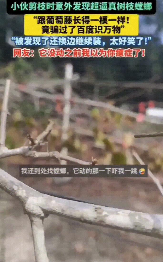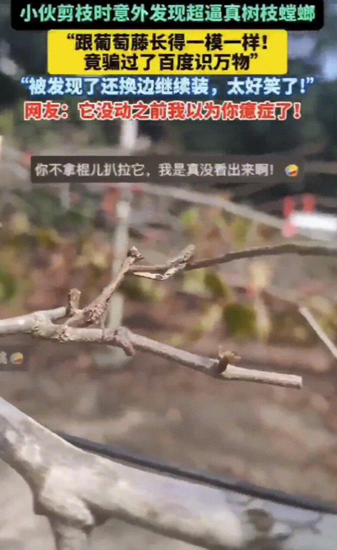 广东湛江,一男子在院子里修剪葡萄藤时,修着修着,手刚要碰到一根细枝,忽然停住了,这根枝条怎么有点怪?他凑近一看,好家伙,居然是只螳螂!那颜色、那纹路,几乎和葡萄枝一模一样,要不是它轻微晃了一下,根本看不出来那是一只活的。网友:他没动之前我都觉得是你癔症了! 男子介绍,当时在修剪葡萄藤,刚好要剪到它时,它动了一下,这才注意到,好奇地拿出手机识别,结果连软件都被糊弄过去,显示不出具体品种,要不是自己眼尖,根本看不出来 更逗的是,明明已经暴露了,这螳螂还绷直了身子,一动不动地继续装树枝。男子用小棍捅了它几下。你说你都被看穿了,还在这硬撑什么呢? 有网友说:拿手机识别,就是一根棍子。 可见这个小动物‘仿生’的厉害。 为了吃到食物,为了躲避天敌,朔就了超凡的能力 说起来,螳螂的伪装,其实是它的生存本能。它并不是在“演戏”,而是在适应环境。大自然的规则很简单:会躲的才能活得久。对螳螂来说,融入背景,比逃跑更安全 这种能力经过长期进化形成,不光能防止被天敌吃掉,也能方便它伏击猎物。看似滑稽的“装树枝”,其实是自然界最聪明的生存策略之一 试想一下,连人类发明的识别软件都能被它骗过去,说明自然的伪装系统,比任何人工算法都更高明。人靠技术生存,动物靠本能生存,但两者的目标其实一样——找到一种让自己安全存在的方式