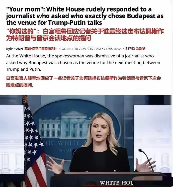 最开始我以为这是一条恶搞的新闻!但是万万没有想到,越来越多的官方媒体开始转载这条消息。 他居然是真的! 当特朗普宣布,他即将在未来某个时间跟普京在布达佩斯会面之后。 在白宫记者招待会上,有芬兰的记者,向白宫发言人提问。 到底是谁最终选择将布达佩斯作为谈判地点的? 本来这是一个非常简单的问题,白宫可以直接回答,也可以避而不谈! 但是万万没有想到,白宫这位美女发言人直接怼了一句! 是你妈决定的! 当时记者就愣住了,而过了没几分钟,白宫通讯部主任,也强调了一句没错,就是你妈! 网友评论: 我倒认为这个回应很妥当!这样的回答威武霸气、才是真正接地气、有烟火味的发布会!因为这个问题本来就不是问题,无论谁提出这个方案,都不该有质疑、有纠结,可这位记者如此追问,完全就是故意找茬、没事找抽型! 如果这是真的,说明美国政客确实是一群草台班子,从之前的万氏泼妇骂街到这位,这完全就是没有职业素养了,毫无疑问能力有问题。也说明美国衰弱指日可待了。 也就是说白了,在哪里会面是普京说了算,川普是被动的。但心里憋屈,记者又不懂进退,揪着人家痛点不放,于是“爆发了”! 很显然,这个提议并不是美国提出的,也不是美国想要的,但又不得不接受。所以,只有发泄情绪。这就是那句“无能狂怒”最好的注释。 各位朋友怎么看?欢迎在评论区留言讨论