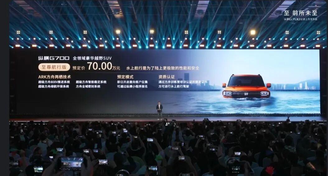 捷途纵横售价30.49万元起,相较于领克900的核心优势在于纵横用上了华为的ADS4.0 新车还推出了70万的至尊航行版 不过可惜用的是单中控屏,如果也用上双联屏的话估计效果会更好 当然了既然能卖到高价,必然得去河里游一下,纵横实现了跨江游,低售价直接竞争高价位的仰望U8