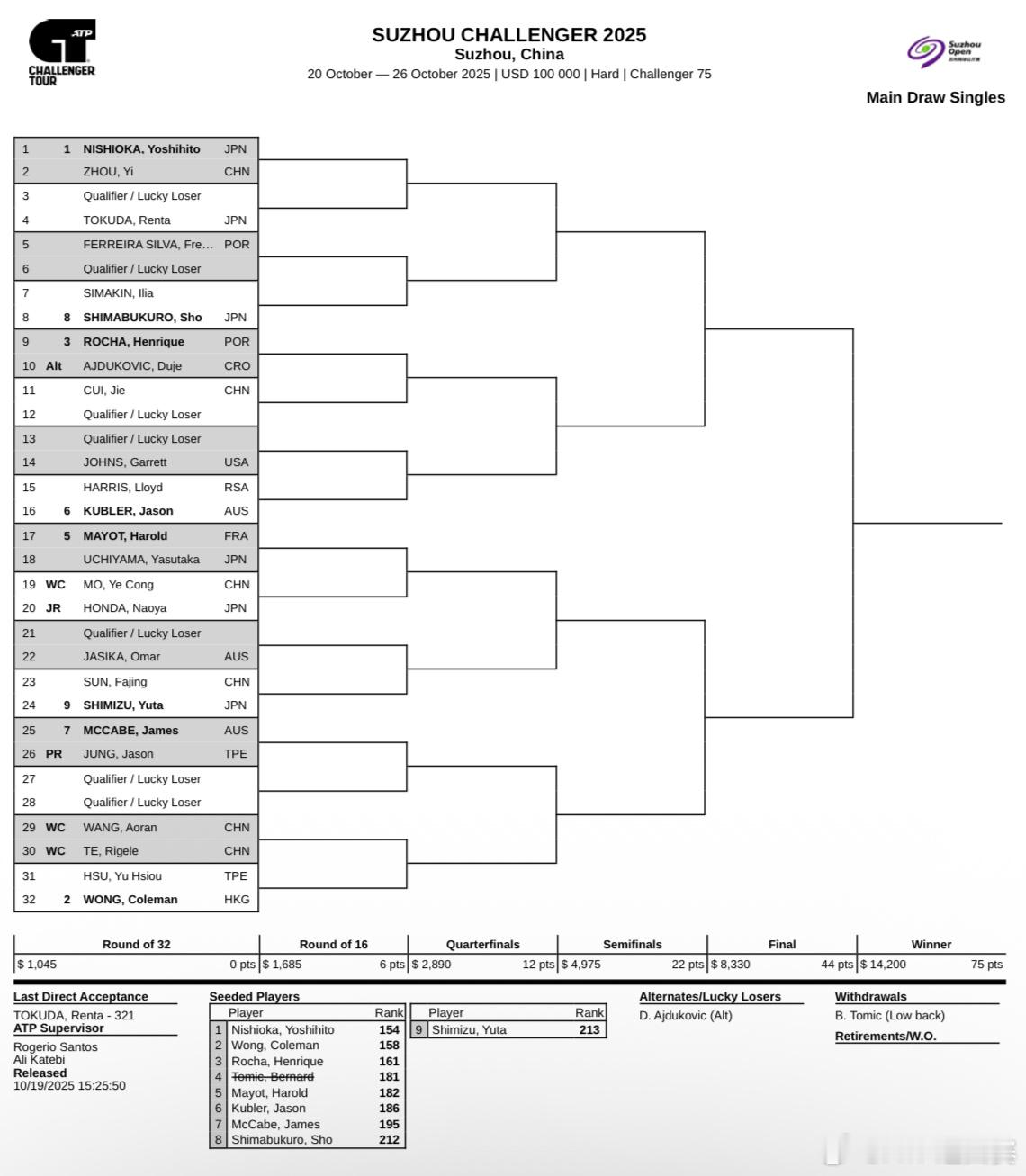 ATP挑战赛苏州站男单签表出炉,中国大陆选手首轮对阵如下👇周意vs西冈良