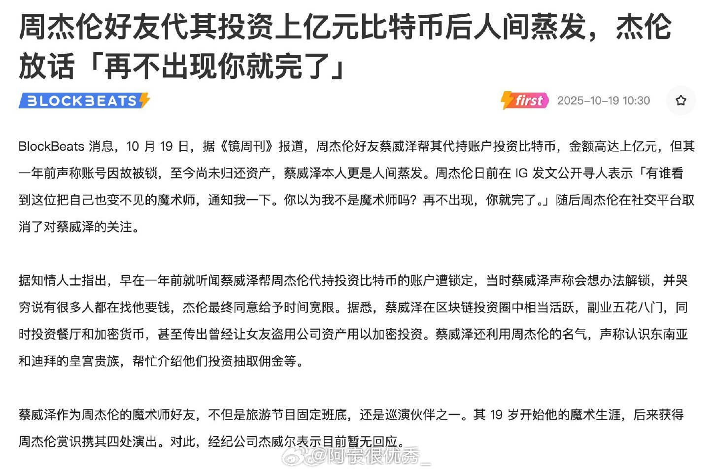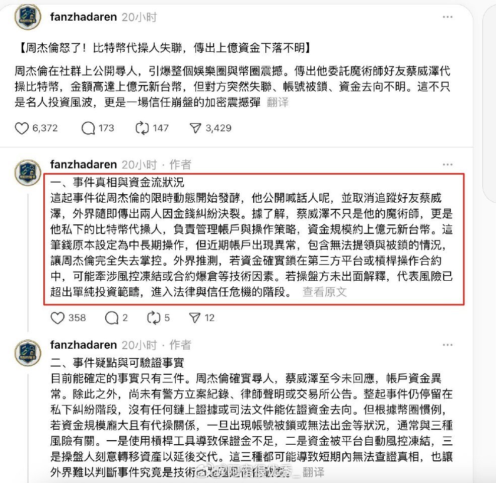 你们吃到这个瓜了吗?好像是周杰伦让好友蔡威泽代炒比特币,然后大概率是爆仓了,也就是投进去的钱一夜之间都蒸发了。。。现在好友也蒸发了,他正在四处找人。