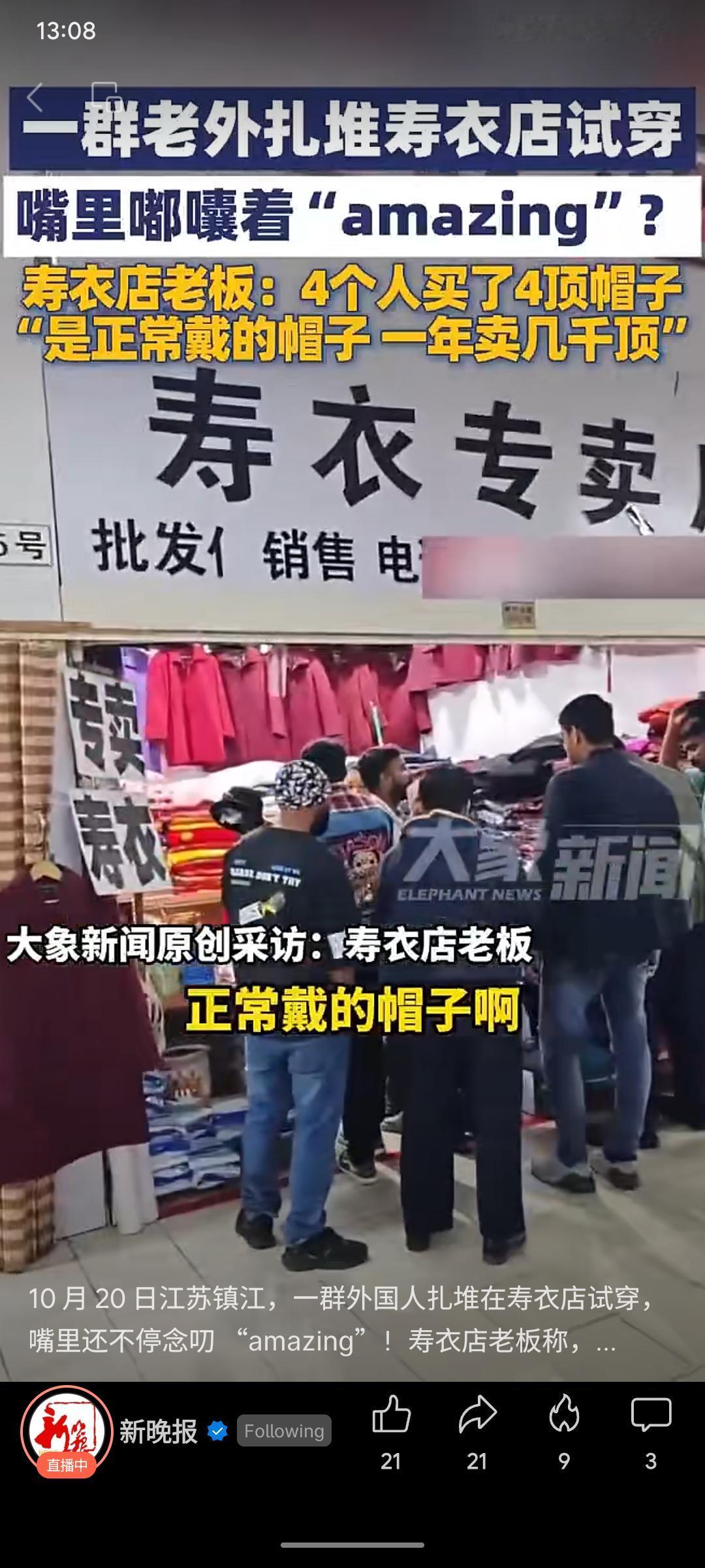 这群老外把寿衣店当时装周现场了,一边试穿一边惊呼amazing。老板懵了:他们真买了四顶帽子当潮品戴!阴间时尚突然在阳间爆火。
