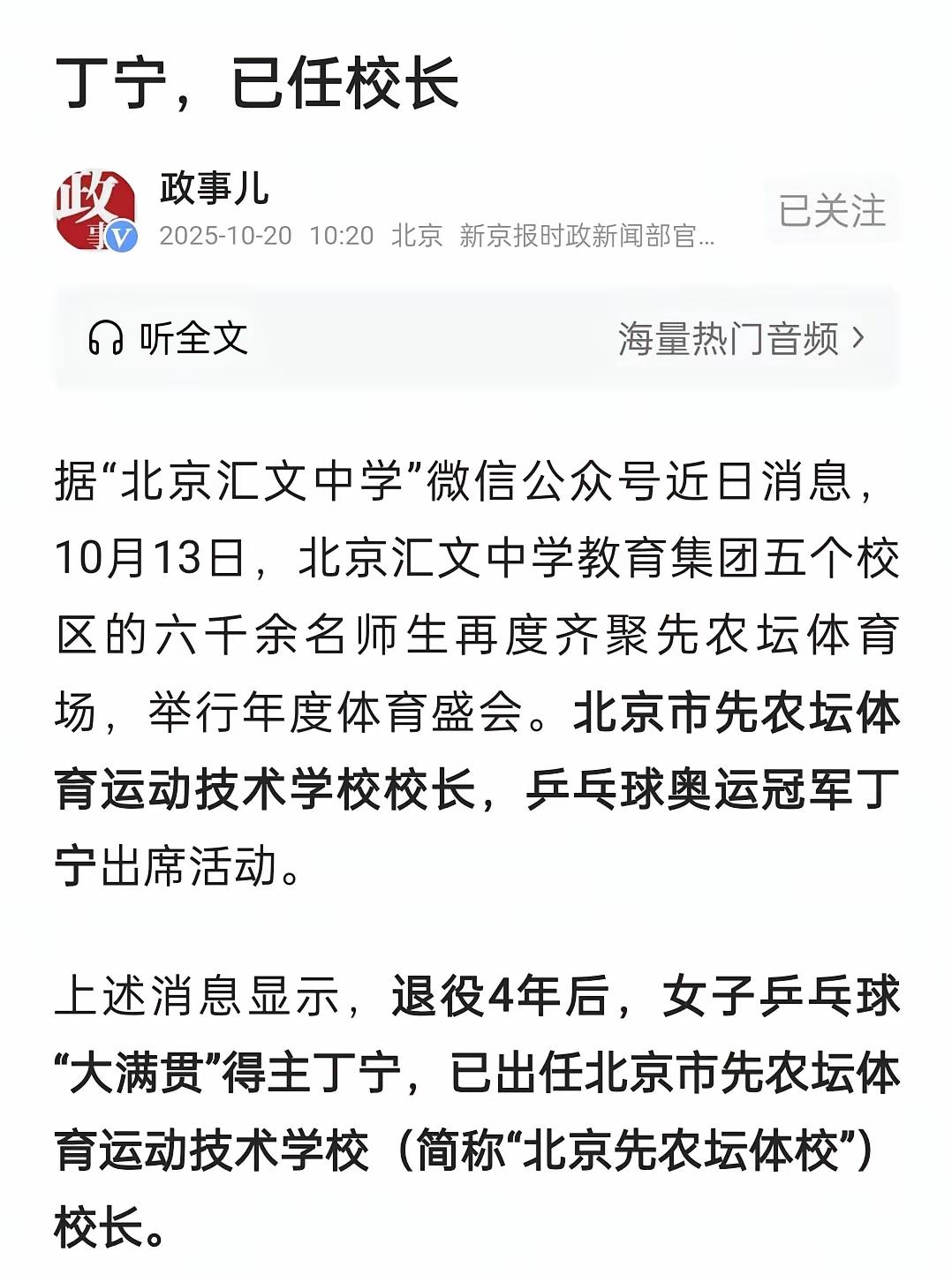 祝贺皓哥、头哥的老熟人丁宁,担任先农坛体校校长,成功成为他俩的领导了![赞][比心][大笑] 丁宁可不简单,是女乒大满贯得主,而且她还有着丰富的行政管理经验,担任先农坛体校校长,实至名归。 网友的调侃也来了,希望丁校长对皓哥、头哥好点![捂脸][大笑]