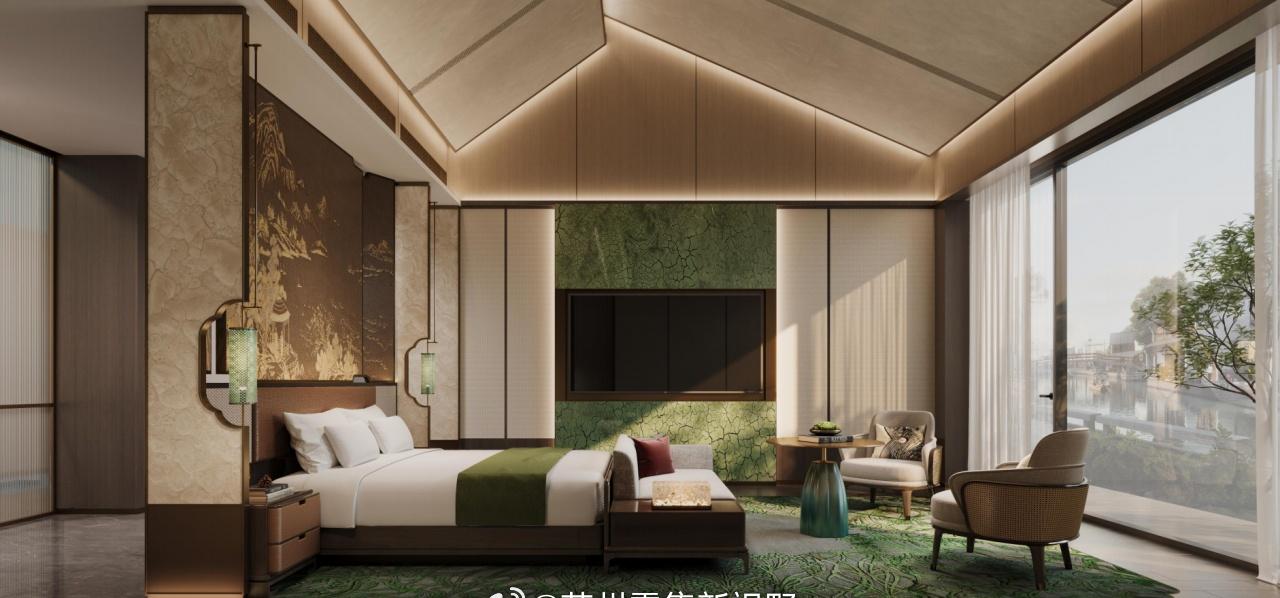 虎丘片区综合改造工程中首个绽放的大型文商旅项目——虎丘璞燊酒店轻启面纱 坐落于虎丘景区西侧约五百米处的苏州虎丘璞燊酒店由苏州名城保护集团建设,引入高端国风度假品牌“璞燊”全套服务体系,南区拥有141间客房、可容纳500余人的宴会厅和众多餐饮空间。2025年10月26日,酒店内部将开启试营业。